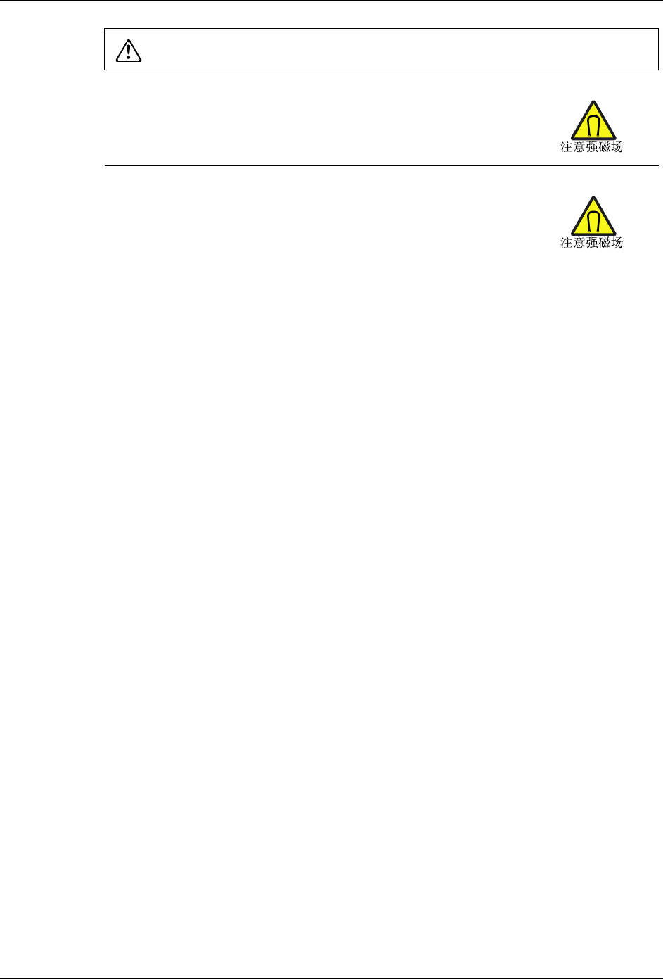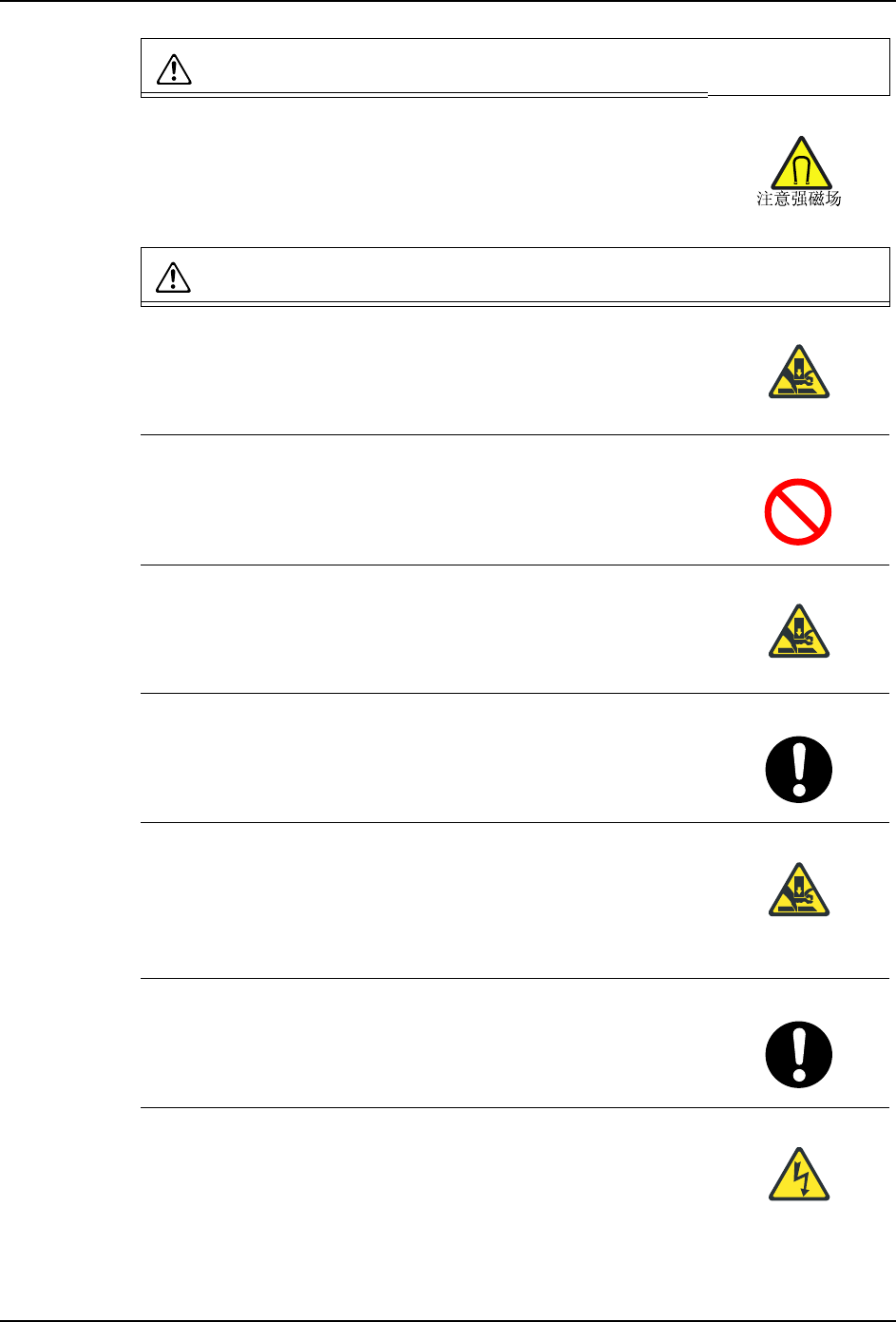 1. 安全指南 SYS-AIMEX-9.0S 6 AIMEX 系统手册 请安装心脏起搏器的人员不要靠 近 Y 轴线性马达。 (跟线性马达 之间请至少保持 400 mm 的作业距离) 。 ・ 线性马达产生 的强磁场可能会影响心脏起搏器的 正常工作。 注意 在开闭安全门时,请注意不要夹 住手指。 ·手指有受伤的危险。 用手移动贴装工作头时,请注意 不要按压定位相机单元。 ·有可能导致相机位置偏 移,影响贴装精度。 在安装吸嘴置放台时,请注意…