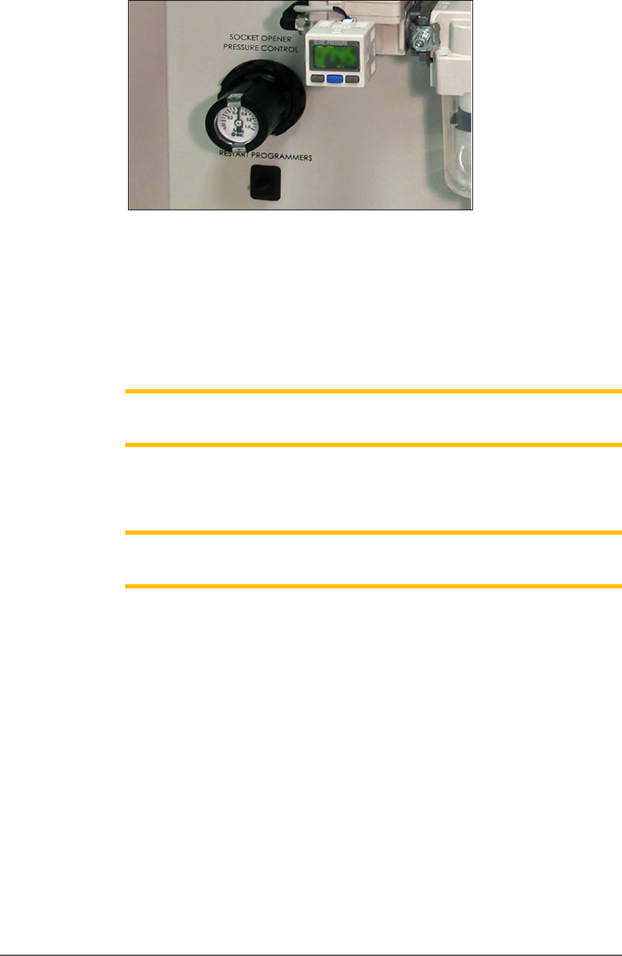 Maint enance ■ Wo rkspace , He ad and Gant ry - 100 - Data I/O ■ 096 - 0 465 - 00 1C Figure 58: The Soc ke t Open er Pr ess ure Cont rol k nob with bui lt - in gauge on the Power P anel. 4. At the Power P anel on the lef…