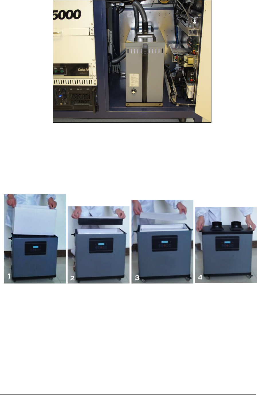 Maint enance ■ The Laser Mod ule and Shuttl e - 128 - Data I/O ■ 096 - 046 5 - 00 1C Figure 77: The Fume Extra ctor insi de the fron t of the PS V5000. 4. To continu e, see the replacem ent instr uctions and part n umber…