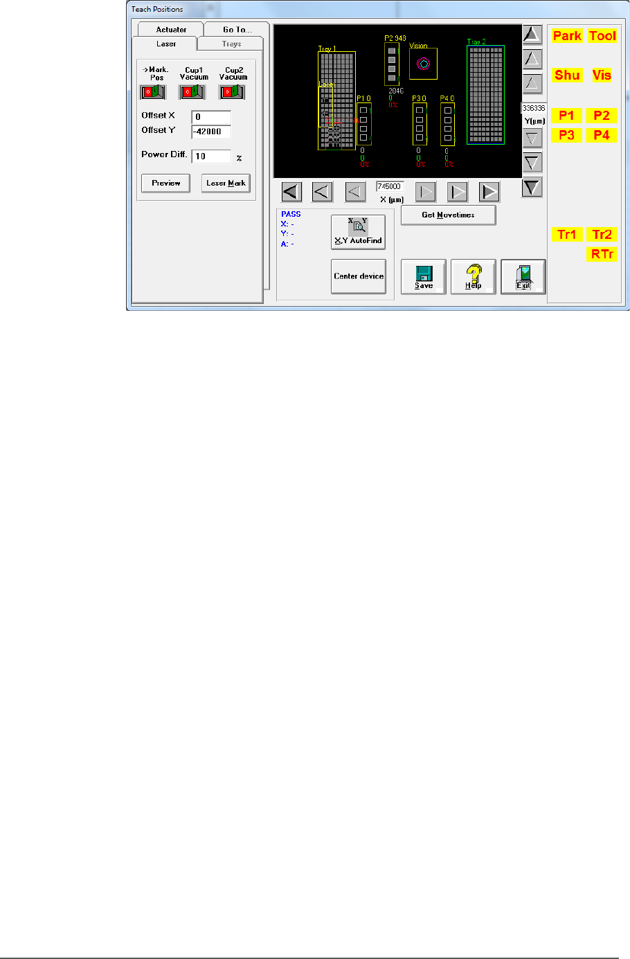 ■ Setting U p the Lase r Mar king M odule □ CH700 Configur ation PSV5000 O wner ’s M anual - 59 - Figur e 35: The Laser ta b in the Gantr y wind ow . See instr uctions in st ep 3 abo ve for descriptions of controls on th…