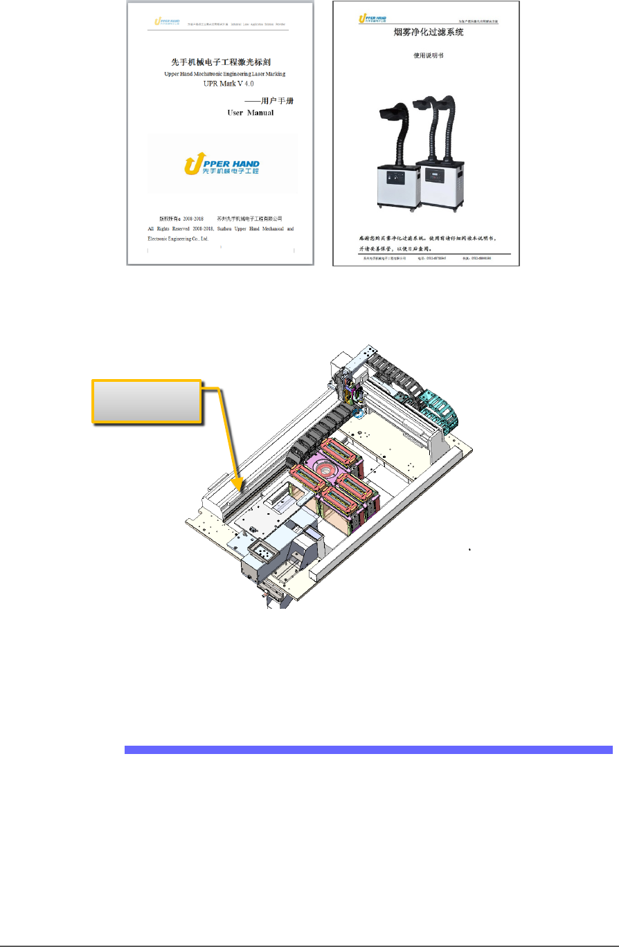 Marking Option ≡ Install ing th e Laser Shutt le Mod ule PSV5000 O wner ’s M anual - 81 - Figure 44: Manu al s for t he laser de vice marker and Fume E xtractor. Figure 45: Lase r marking u ses a la ser shuttle ex cept…