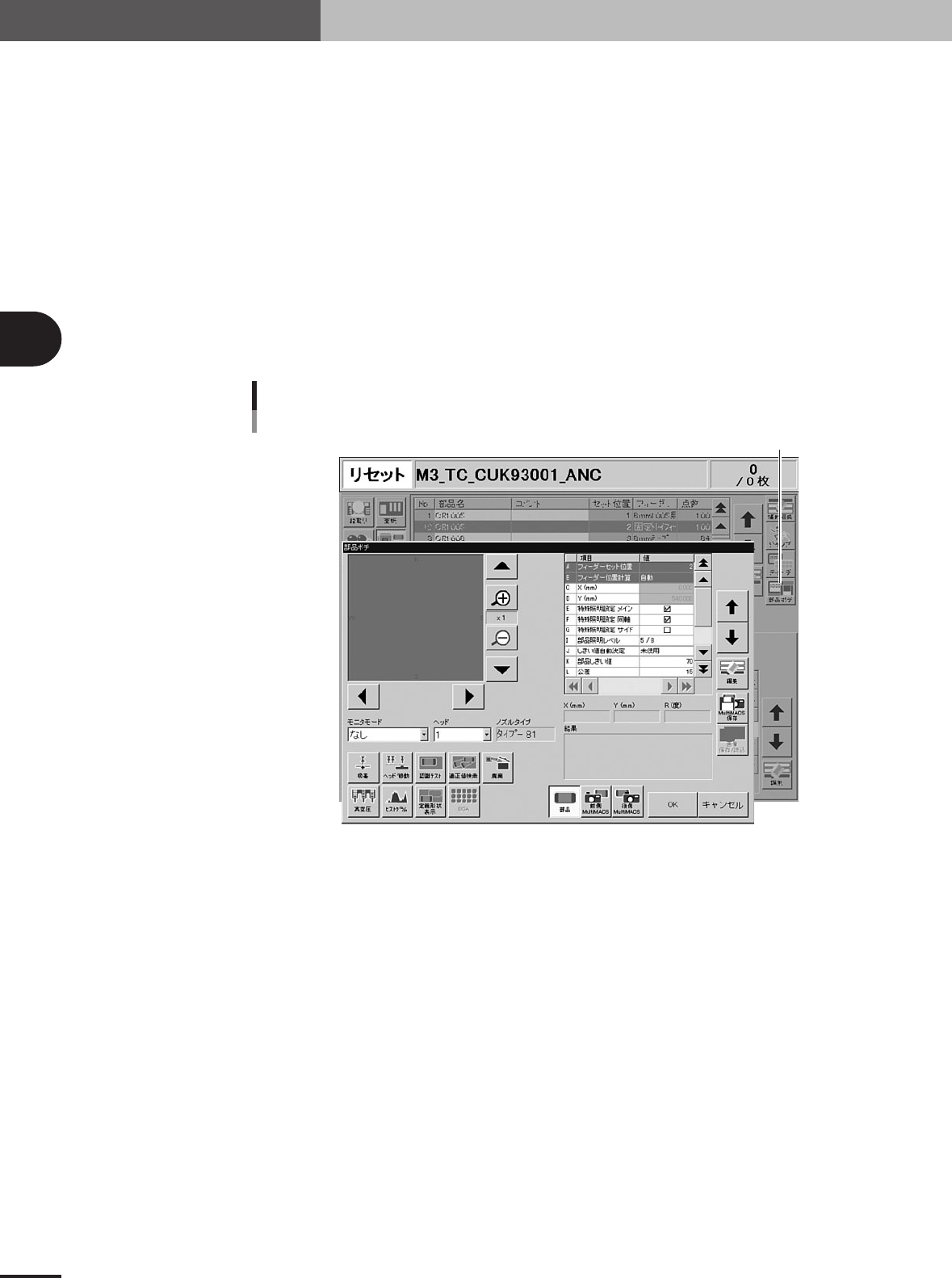 3- 44 3 4. 部品情報を作る 4.9.1 部 品 ポ チ を 実 行 す る 1 部品が段取りしてあるフィーダーをフィーダープレートに取り付けます。吸着パラメー ターの「フィーダーセット位置」でフィーダープレート N o . を指定しているときは、指 定した番号にフィーダーをセットしてください。指定していないときは部品ポチ画面で フィーダーセット位置の設定を行うこと…