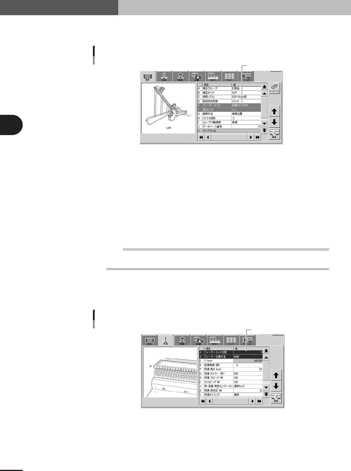 3- 51 3 4. 部品情報を作る 6 スティックィーダーの場合は「自動」に設定します。 ■ 「 フィーダー位置計算」について… 部品を吸着する位置座標の求め方について設定するパラメーターです。 自動 フィーダープレート基準位置から、吸着位置までの値を自動算出します。 「フィーダーセット位 置」に任意の数字を入力するだけで吸着位置が決まり…