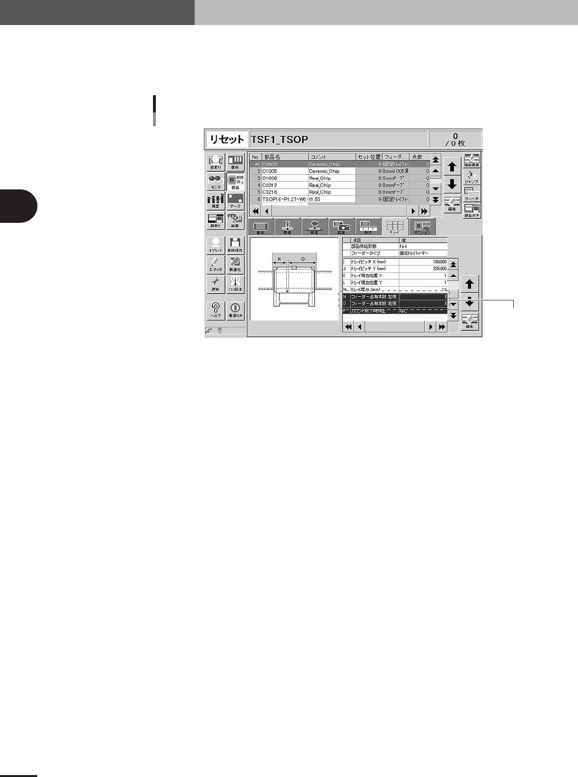 3- 58 3 4. 部品情報を作る N,O :フィーダー占有本数左側、右側 トレイシャトルフィーダーを取り付けたとき、 Step5 で設定したフィーダーセット位置を基準と して左右何本のフィーダーが取り付け不可能になるかを設定します。トレイシャトルフィーダー の場合は、固定値で左右ともに「3 」 を入力してください。 設定項目 フィーダー占有幅 TSF1 26319-E5-00 P: カウント…