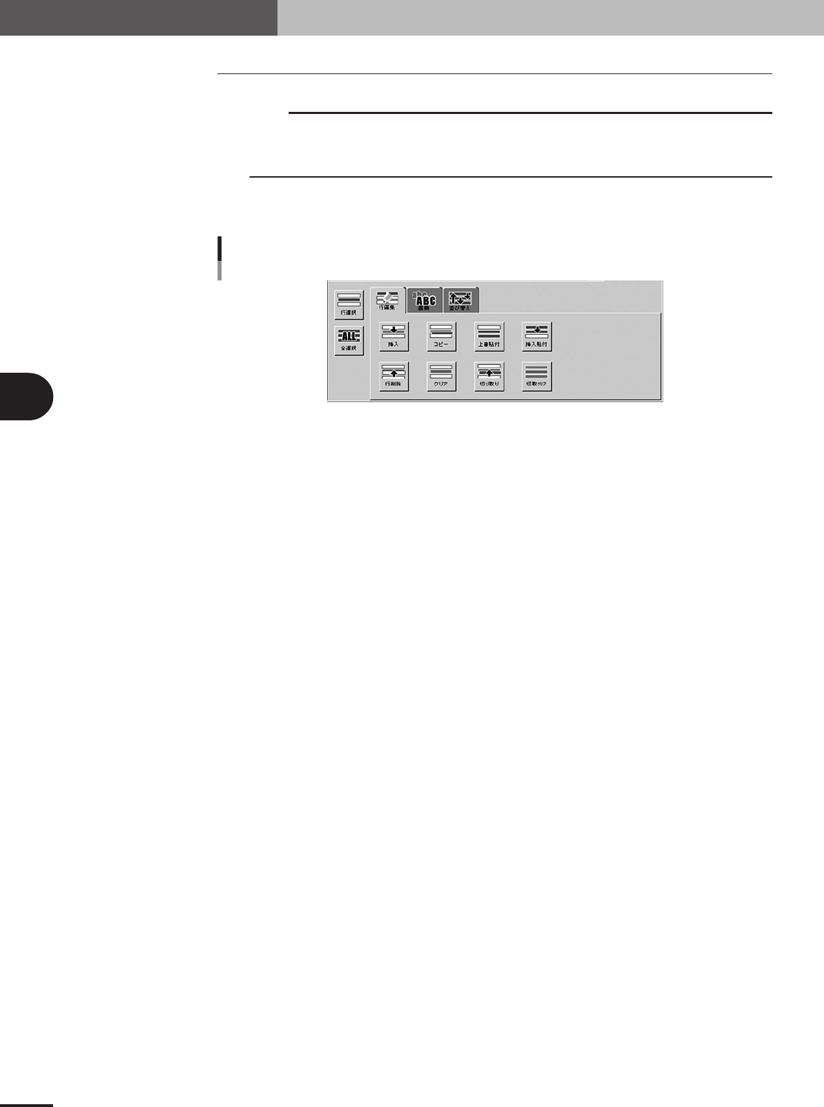 4- 18 機 能 を 活 用 す る 4 5. 補助編集機能 5.3 行 編 集 c 注意 行編集は、「No.」列以外でソートされた状態では使用出来ません。行編集を実行する時には必ず 「 No.」列で昇順にソートされている必要があります。また、選択範囲が指定されていない時には現在 の行(カーソルのある位置)が選択されている状態になります。 「行編集」タブの中には、グリッドの選択範囲のデータを行単位で編集する機能がボタンとして設定 され…