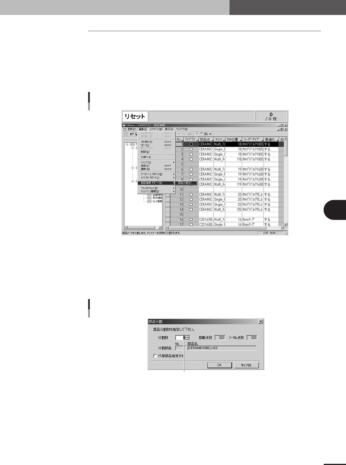 5- 13 5 1. エディターによる編集 1.5 部品分割 1つの部品を複数の箇所に分割登録することができます。 「部品を複数の箇所に登録する」というこ とは、同じ部品を複数のフィーダーから供給することができるということです。同一の部品を多く 使用する場合などでは、一枚当たりの所要時間を短縮することができます。 1 2 …