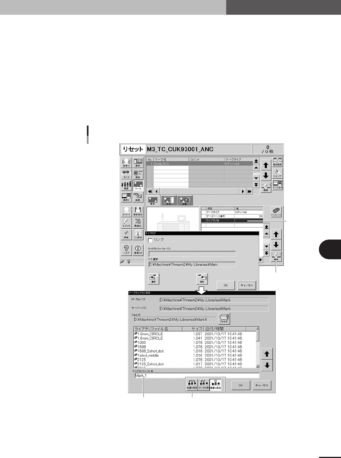 6- 14 6 3. XML ライブラリーを作る ■ エディターの場合 ライブラリー登録の前に部品またはマークの補助調整を行ってください。 1 登録を行うライブラリーにカーソルを合わせ[ 保存] ボタンをクリックしてください。 2 3 [保存]ボタン ライブラリー登録名 ライブラリー登録 エディター 機差情報の選…