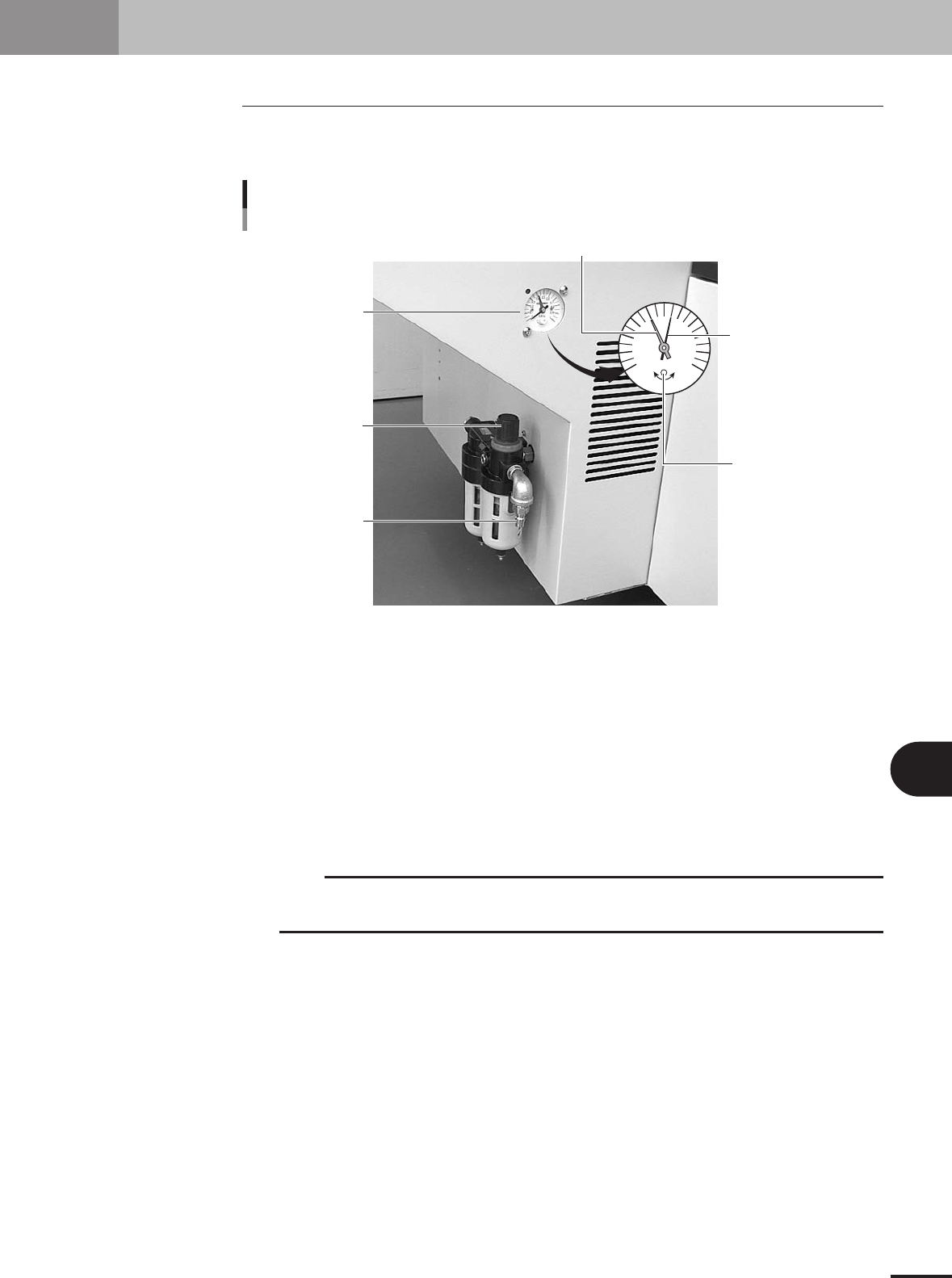 本機に供給するエア圧力を調整します。圧力表示計の黒針が 0.55MPa(消費量 60NL/ 分)を指