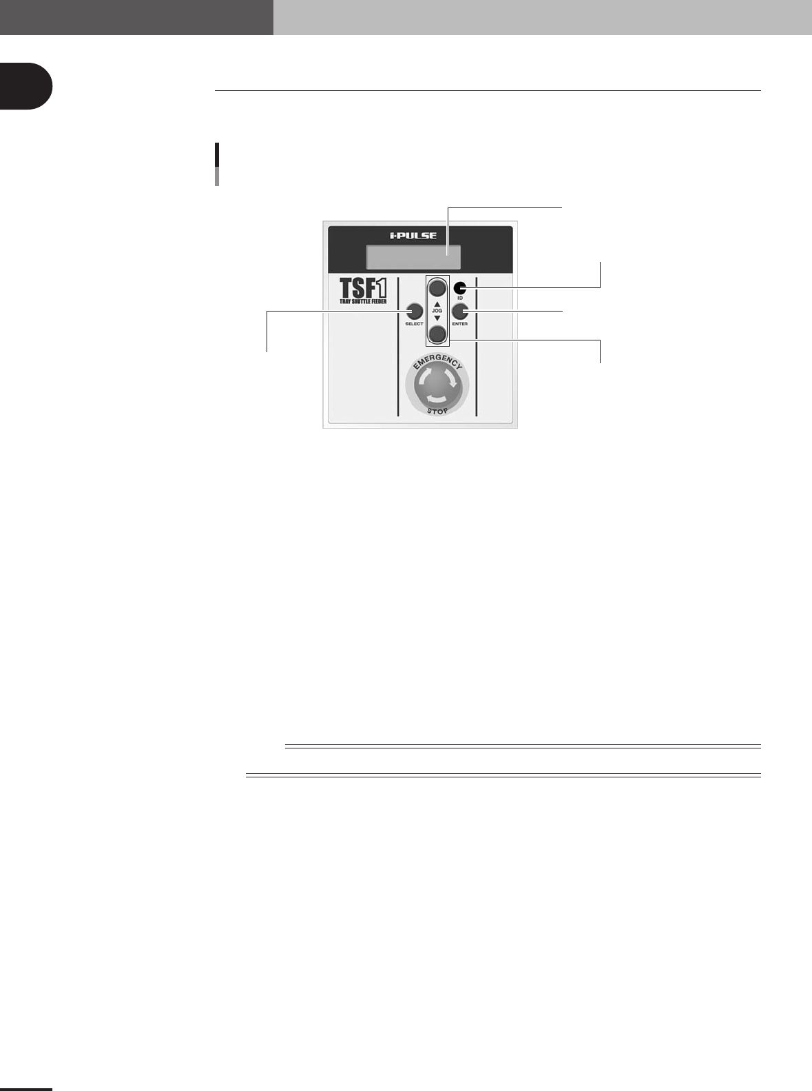 1- 4 各 部 の 名 称 と 働 き 1 1.2 操作スイッチ部詳細 操作スイッチの使用方法を説明します。 ENTERボタン ID設定ダイヤル JOGボタン SELECTボタン ディスプレイ 操作スイッチ部詳細 27104-5V-00 SELECT ボ タ ン マニュアル動作の選択(部品交換位置移動 / 原点復帰)をします。 ENTER ボ タ ン 設定されたマニュアル動作を実行します。 ID 設定ダイヤル TSF1 をセットするポ…