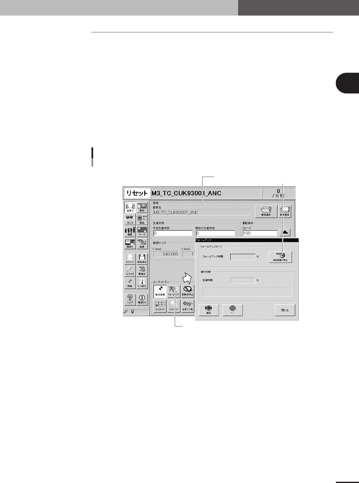 段取り画面の[ウォームアップ]ボタンを押すと「ウォームアップ」画面が現れます。