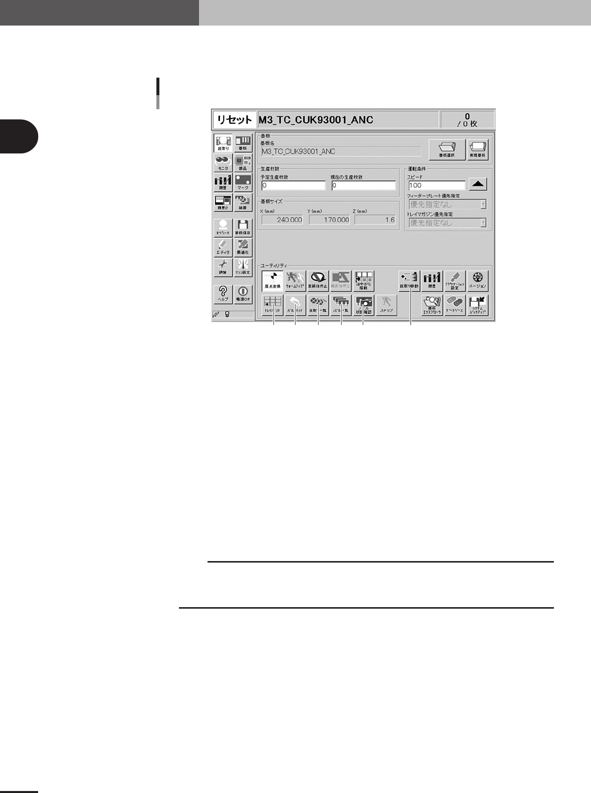 2- 18 基 本 的 な 操 作 に つ い て 2 4. 生産開始と終了 3 他の段取り項目を確認します。 「段取り」画面に戻り、以下のボタンを押して必要な確認や設定をしてください。 4321 5 6 「段取り」画面 26201-E5-1C 1 [ ノズル状態確認] ノズル先端の汚れ状態を部品認識用カメラでチェックします。このチェックの結果がエラーに なった場合は、ノズルを清掃をしてください。 2 [ ノズル一覧] 各ヘッドに使用す…