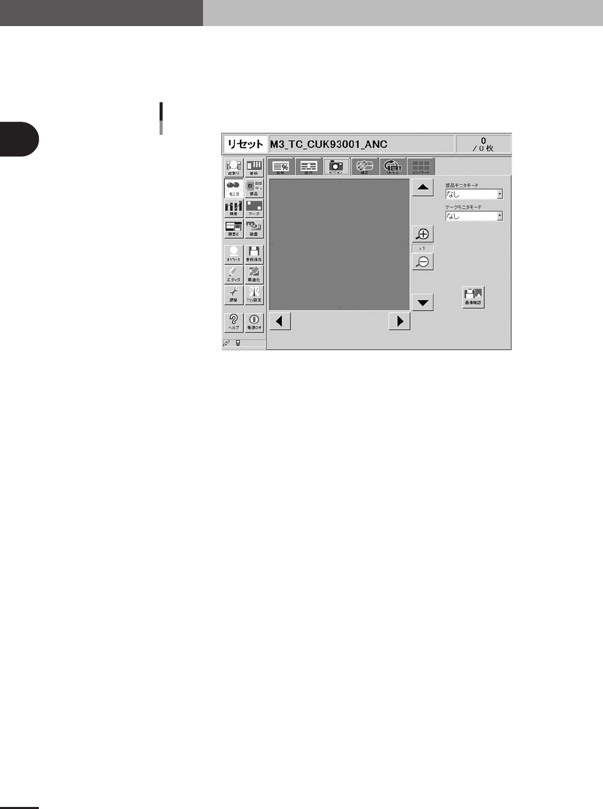 2- 25 基 本 的 な 操 作 に つ い て 2 4. 生産開始と終了 「エッジ位置」 リードや部品のエッジの位置にクロスカーソルが表示されます。 「最終位置」 部品の中心位置にクロスカーソルが表示されます。 ・ マークモニタモード マーク認識時のモニタ上への表示モードを設定します。設定された項目により画像上へ認識結果 の数字や2値化画像などが表示されます。このモニタモードは、運転中でも変更可能です。 「なし」 カメラで撮像した画…