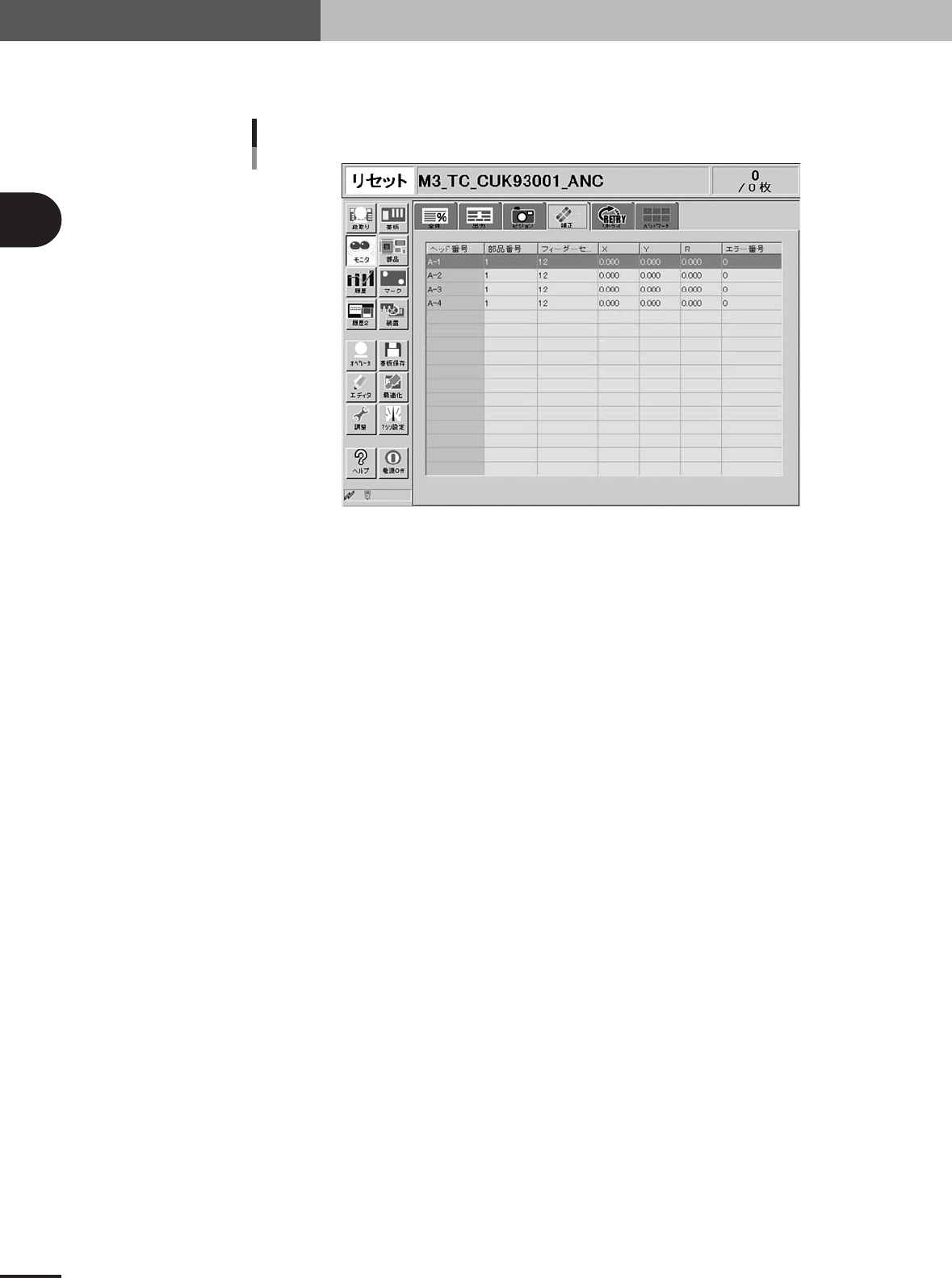 自動運転中の部品認識結果の補正量、エラーコードなどが一覧表形式で表示されます。