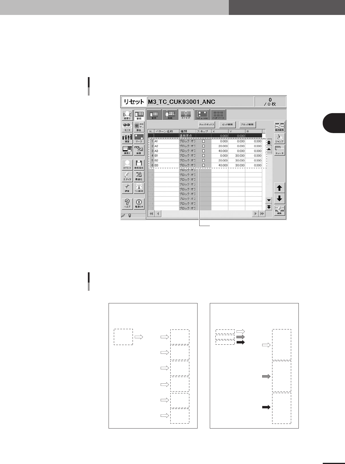 基板のブロック単位で設定する「ブロック」フィデューシャル、搭載データ単位で設定する