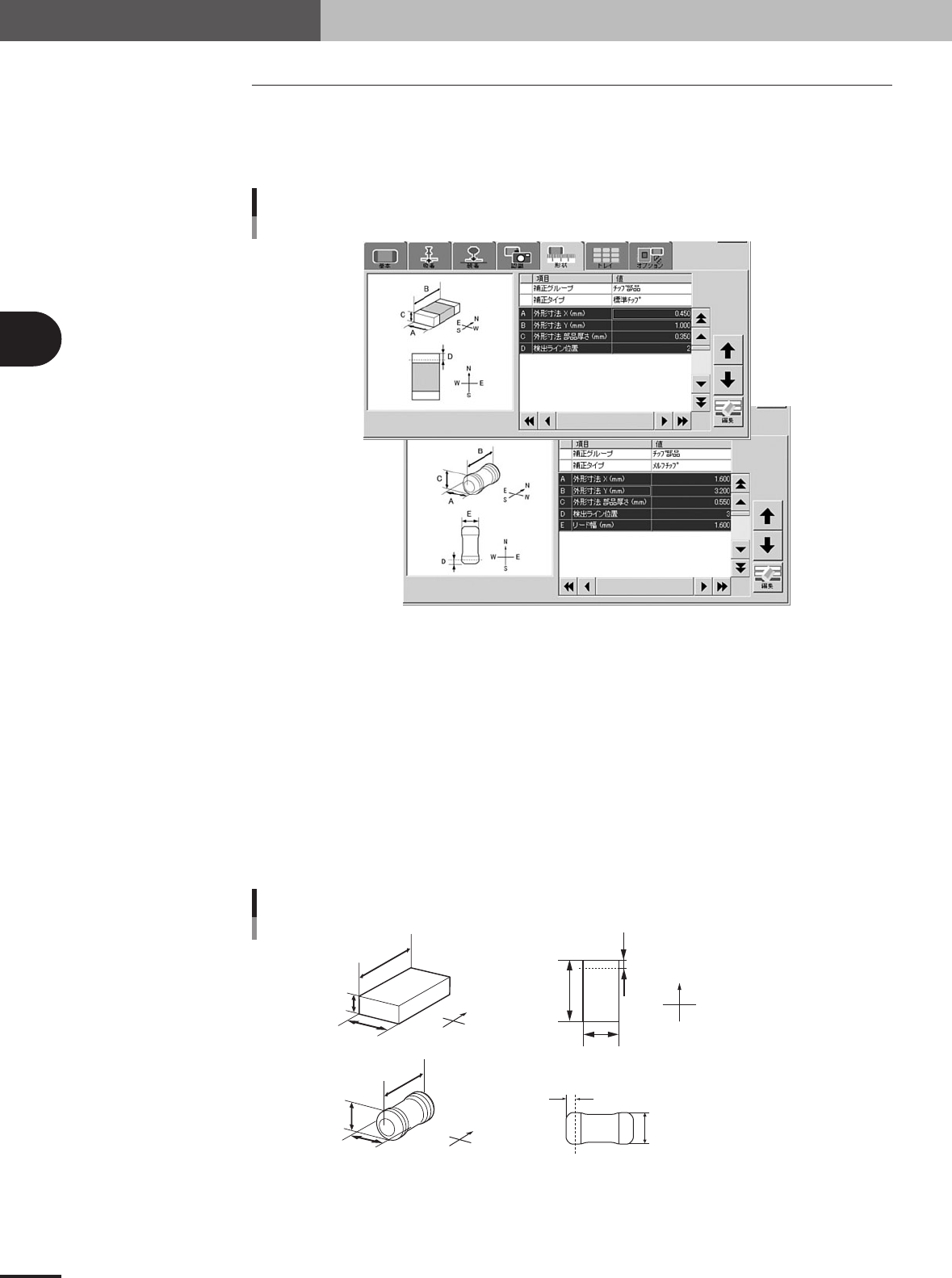 3- 34 3 4. 部品情報を作る 4.6 形状パラメーター 「補正タイプ」を設定した後、形状パラメーターを設定してください。 ( 「補 正タイプ」が未設定の場 合は、以下のパラメーターが表示されません。 ) ■ チップ部品の場合 チップ部品 26417-E5-20 A, B: 外形寸法 XY 下図を参照してノギス、マイクロメーターなどで計測した正確な値 (mm) を 入 力 し て くだ さ…