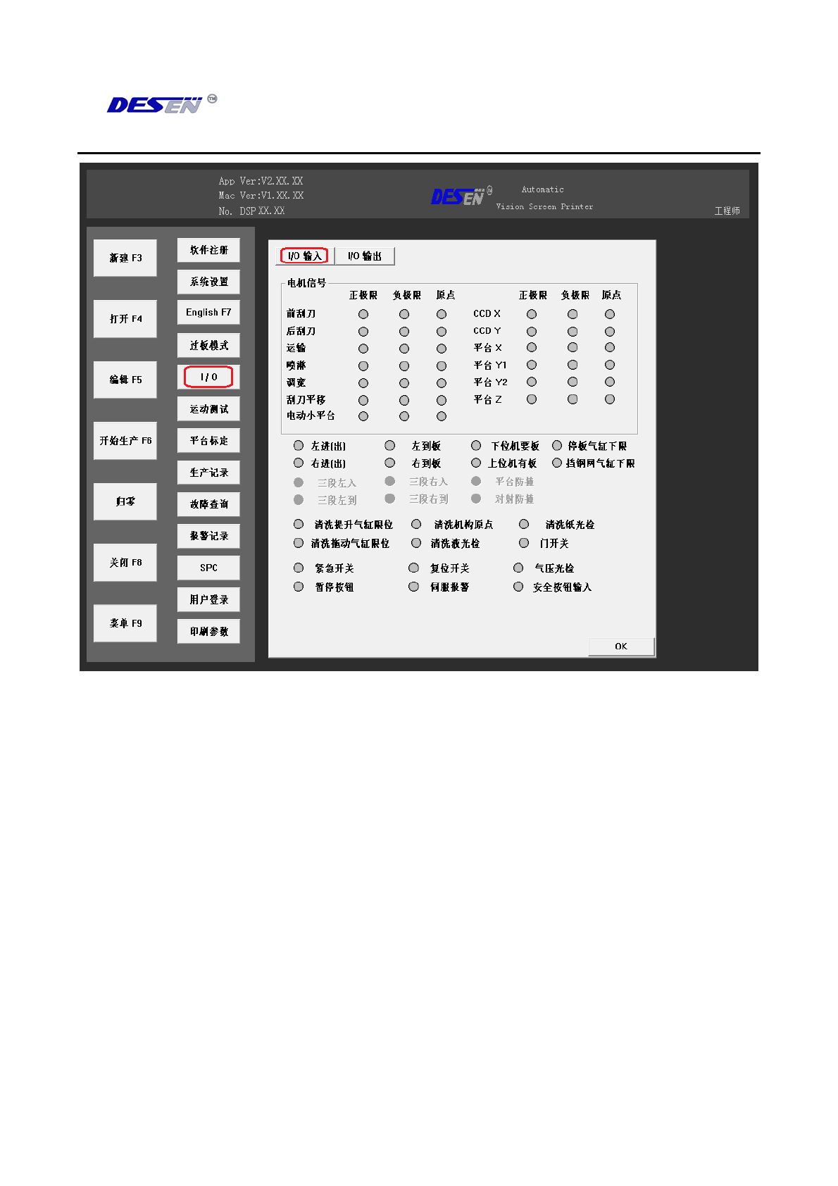 深圳德森精密设备有限公司 第四章 操作 系统说明 38 ( 图 10 - 2) 4 .2.1 2 I/ O 检查 I/O 检查输入 ( 图 11 - 1 ), 输出 ( 图 11 - 2) :