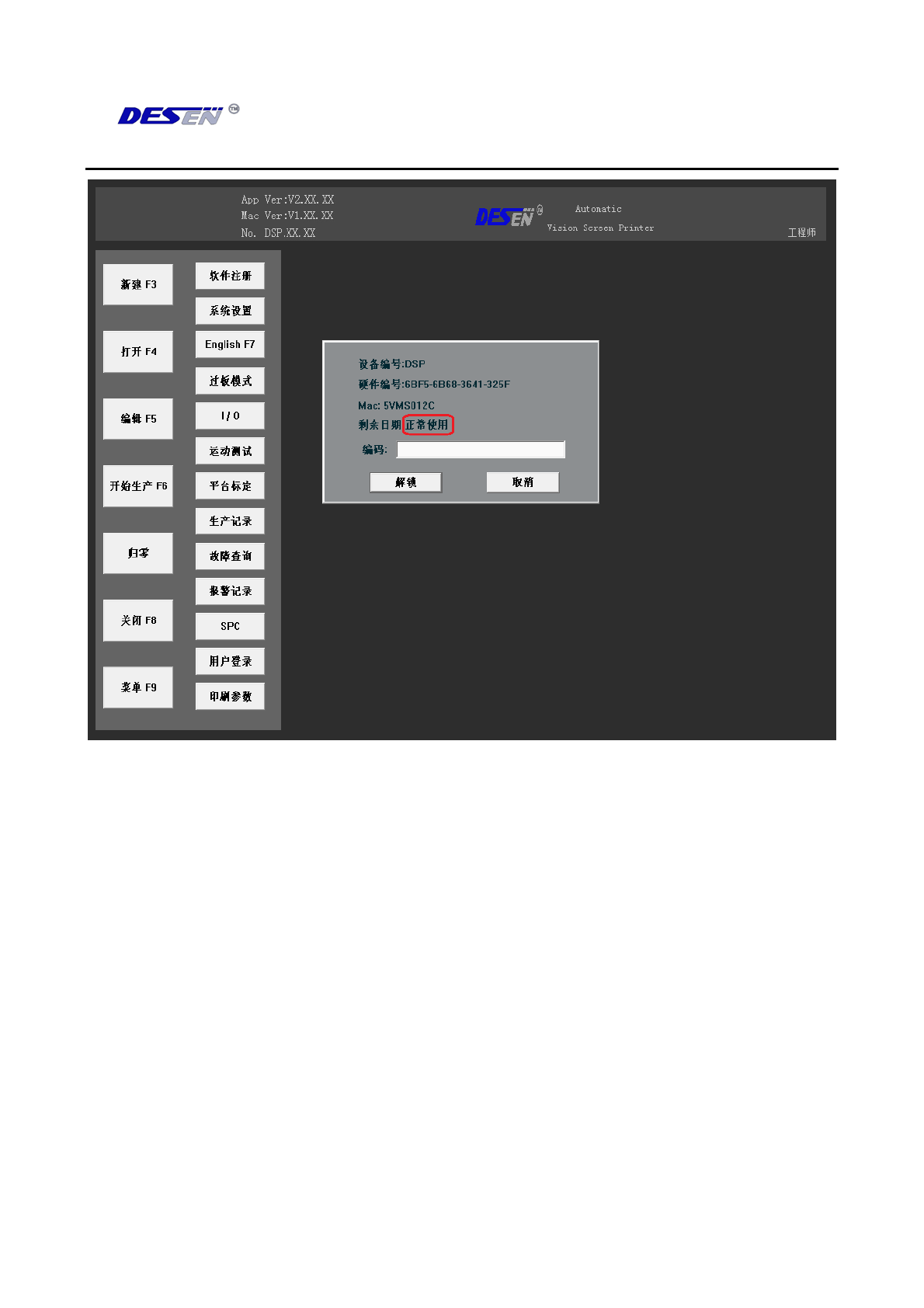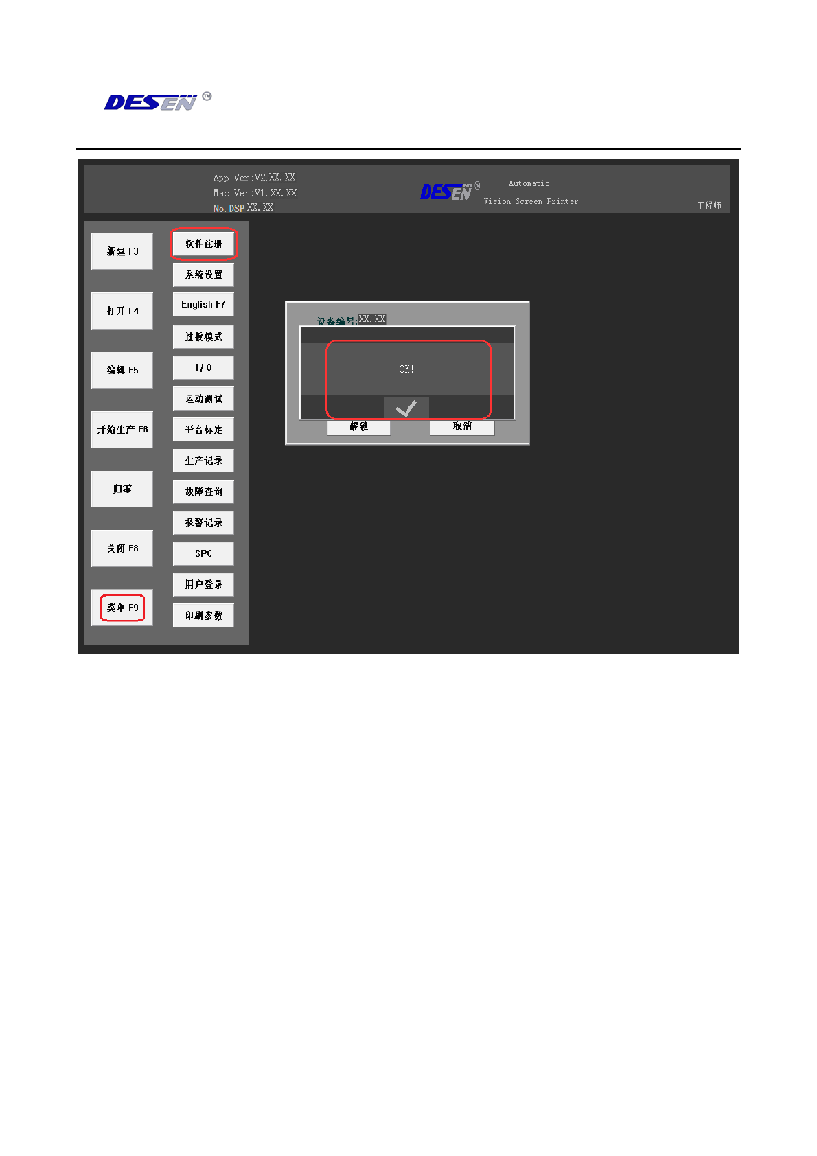深圳德森精密设备有限公司 第四章 操作 系统说明 47 (图 15 ) 恭喜你,提示你已 经成功升级啦 !设备就可 以放心正常使 用了! 4. 3.3 备 注说明 V2 软件能支持以下 Cla ssi c1 00 8,H it o,N av iga to r, Emp at hy, 10 08, 10 08 H,1 00 8T, 20 08, 40 08 ,12 00 , 1500 等德森全自动视觉锡膏印刷机型号上 使用。