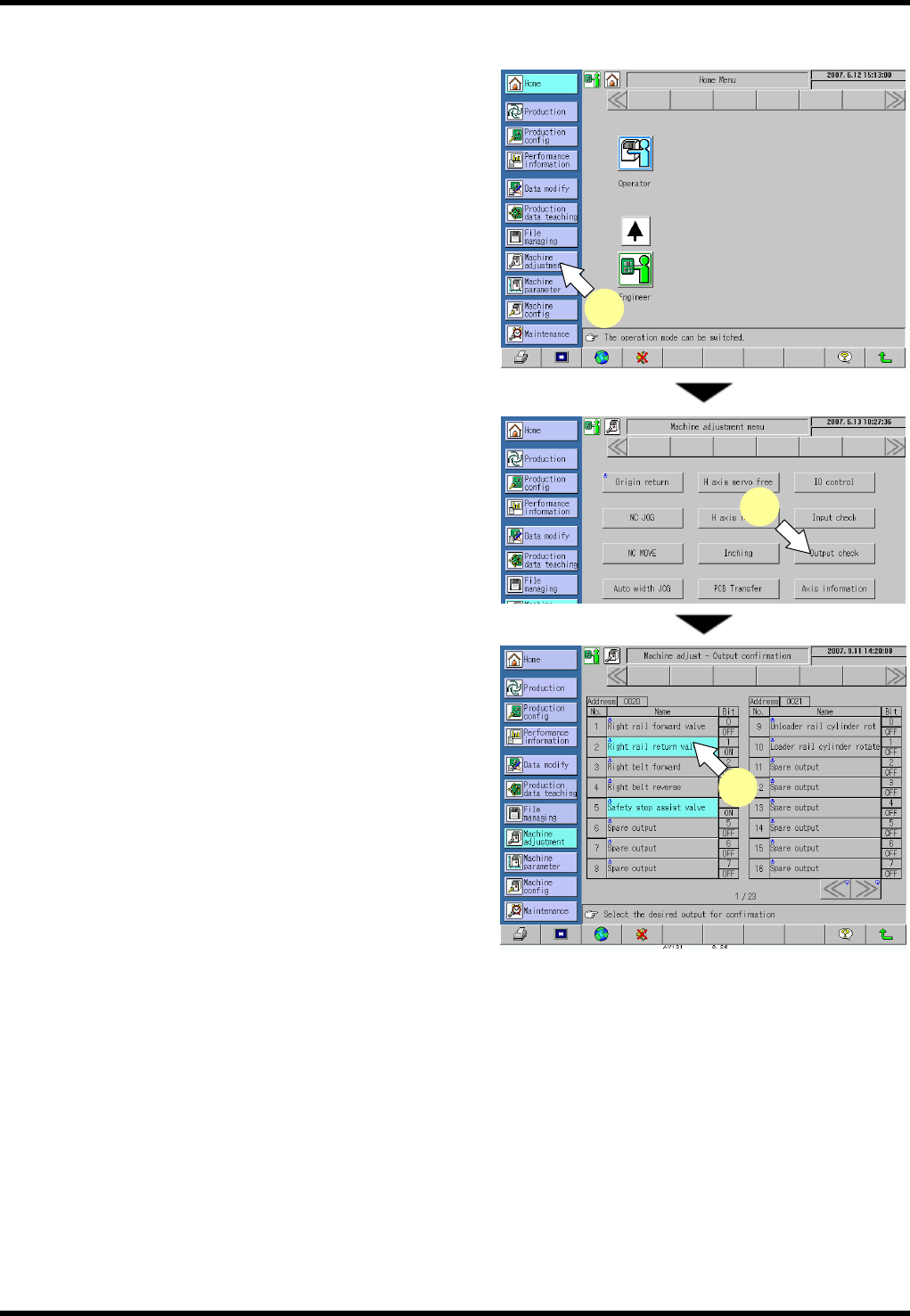 The “Machine adjust - Output check” screen