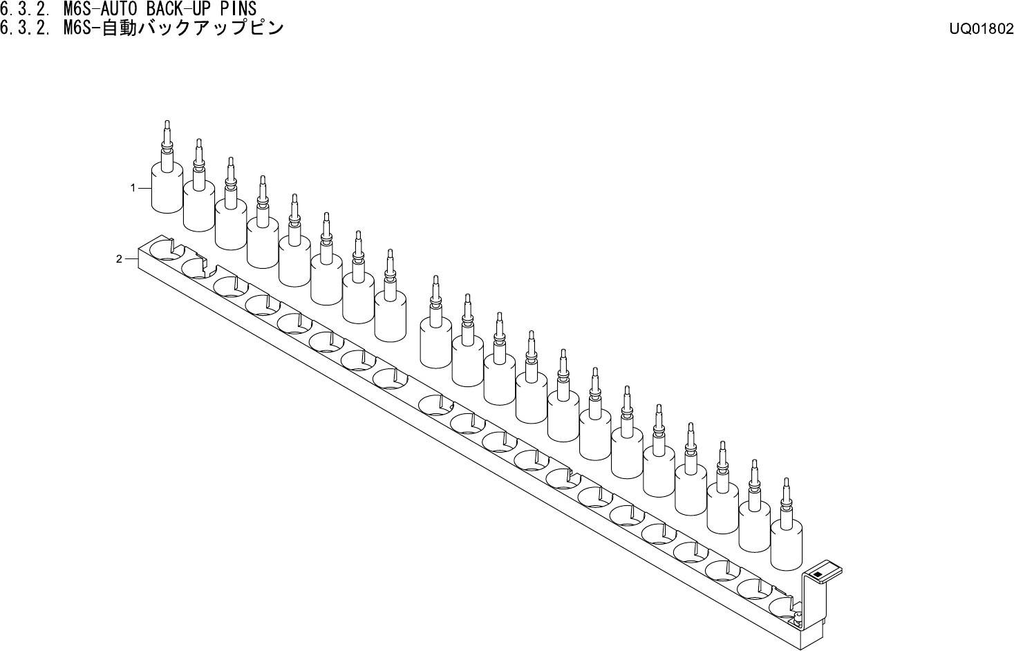 6.3.2. M6S-AUTO BACK-UP PINS 6.3.2. M6S- 自動バックアップピン UQ01802 No. Drg.No. & Code No. QTY Description Rating Materials Remark 番号 図番 & コード番号 個数 品名 規格 材質 備考 1 AA34W02 20 PIN, BACKUP ピン バックアップ OT 2 AA2RA02 1 HOLDER, P…