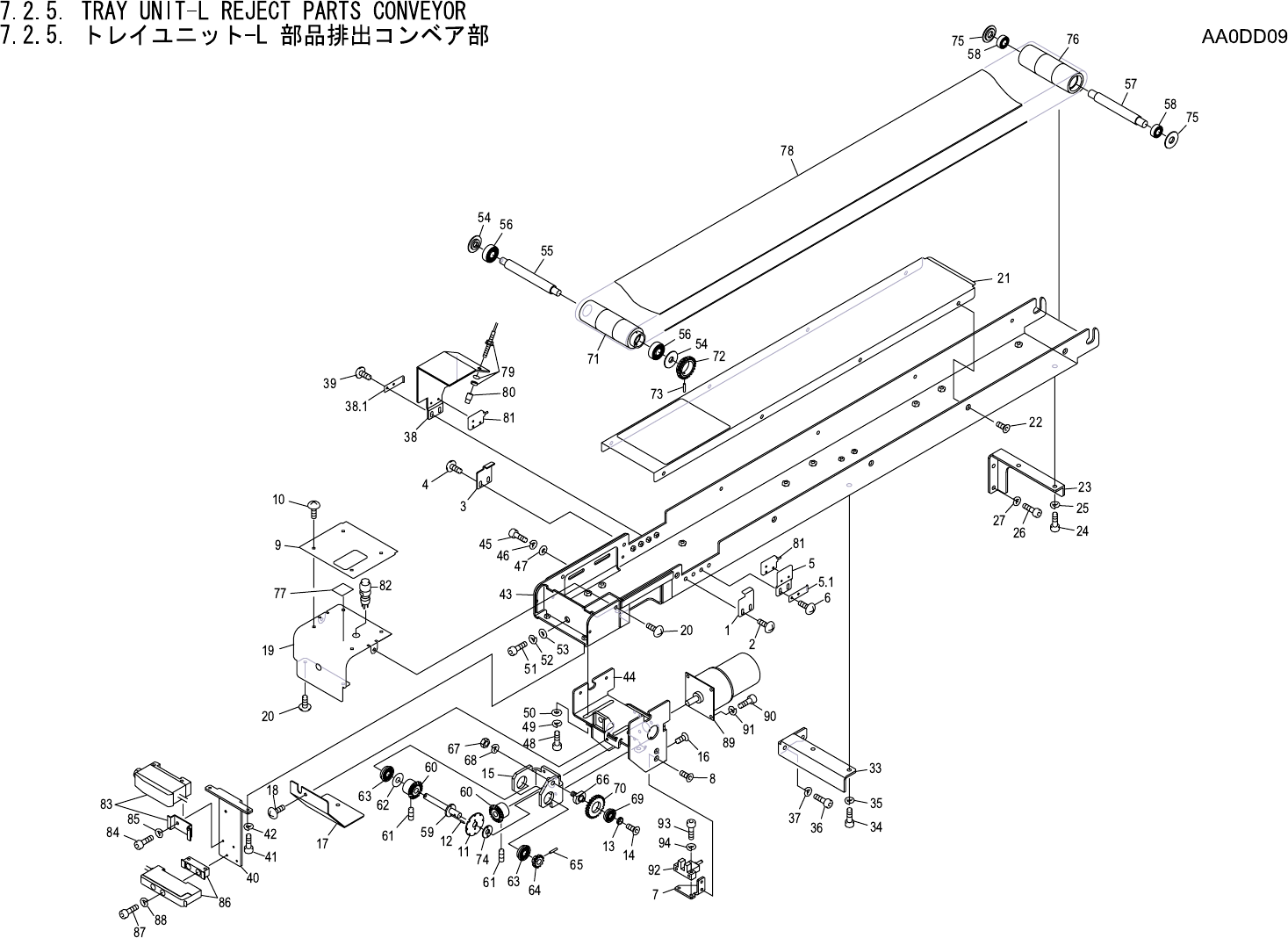 7.2.5. TRAY UNIT-L REJECT PARTS CONVEYOR 7.2.5. トレイユニット -L 部品排出コンベア部 AA0DD09 No. Drg.No. & Code No. QTY Description Rating Materials Remark 番号 図番 & コード番号 個数 品名 規格 材質 備考 1 PB03461 1 BKT BKT FE 2 K5170T 2 SCREW, C…