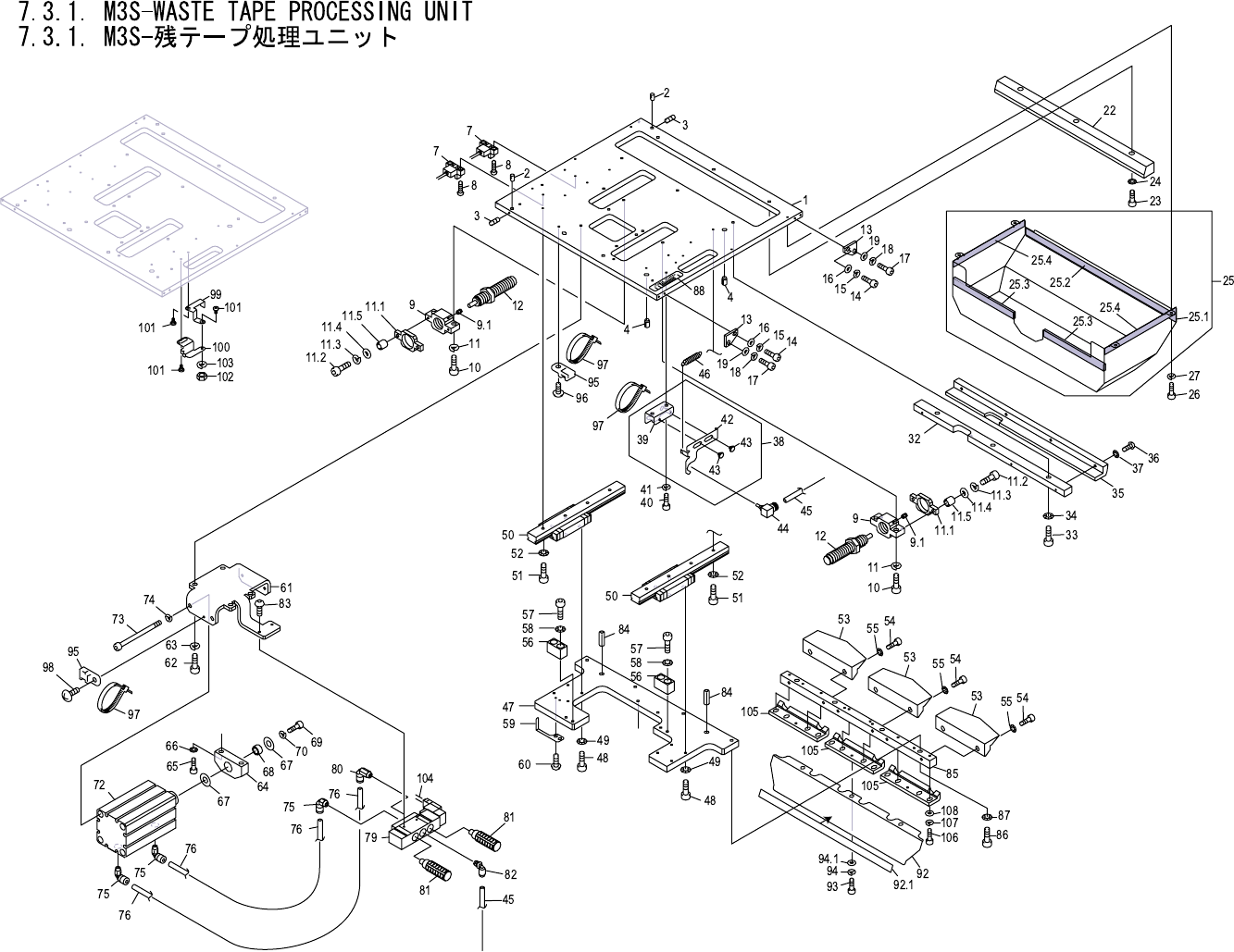 7.3.1. M3S-WASTE TAPE PROCESSING UNIT 7.3.1. M3S- 残テープ処理ユニット UC00124 No. Drg.No. & Code No. QTY Description Rating Materials Remark 番号 図番 & コード番号 個数 品名 規格 材質 備考 1 PM007X0 1 PLATE プレート FE 2 PM04432 2 PIN ピン FE 3 …