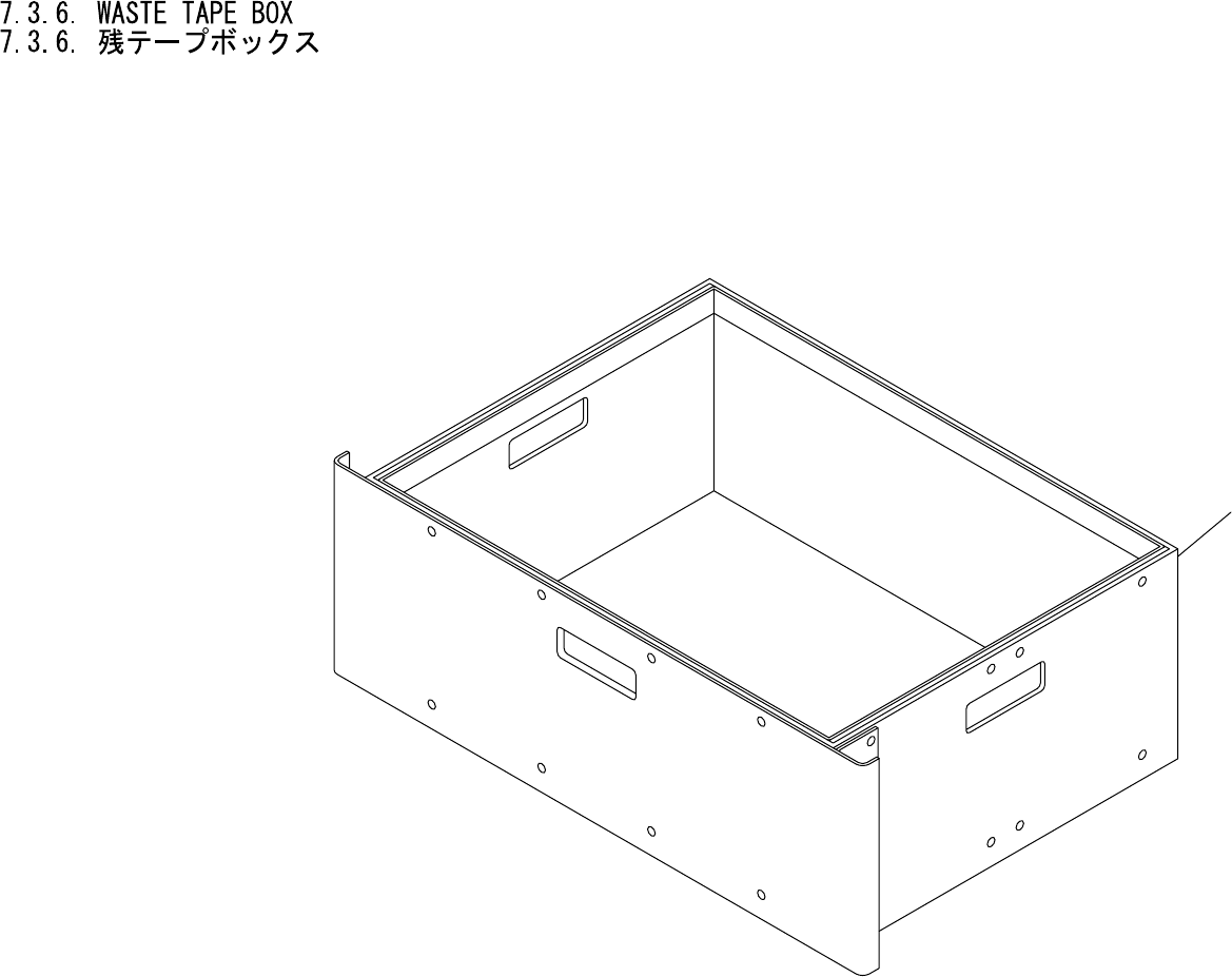 7.3.6. WASTE TAPE BOX 7.3.6. 残テープボックス XB02110 No. Drg.No. & Code No. QTY Description Rating Materials Remark 番号 図番 & コード番号 個数 品名 規格 材質 備考 1 XB02110 1 BOX, DUST BOX ダ スト OT 7. PARTS SUPPLY / 部品供給 151 PTS-NXT-06JE