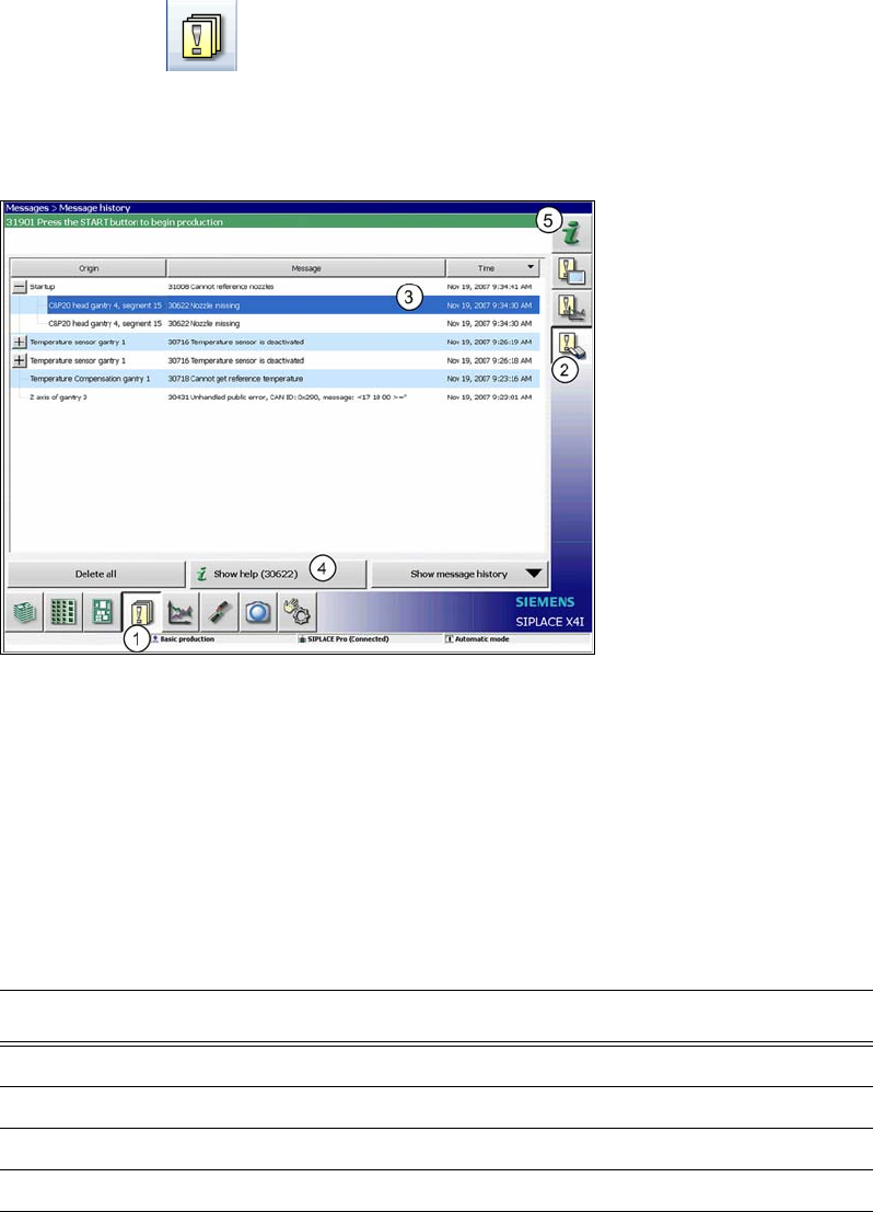 5 Working with the machine User Manual SIPLACE SX1/SX2/DX1/DX2 5.6 Alert information and online help From software version SC.706.xx Version 06/2012 EN 262 5 Fig. 5.6 - 1 "Production" view with aler t message (…