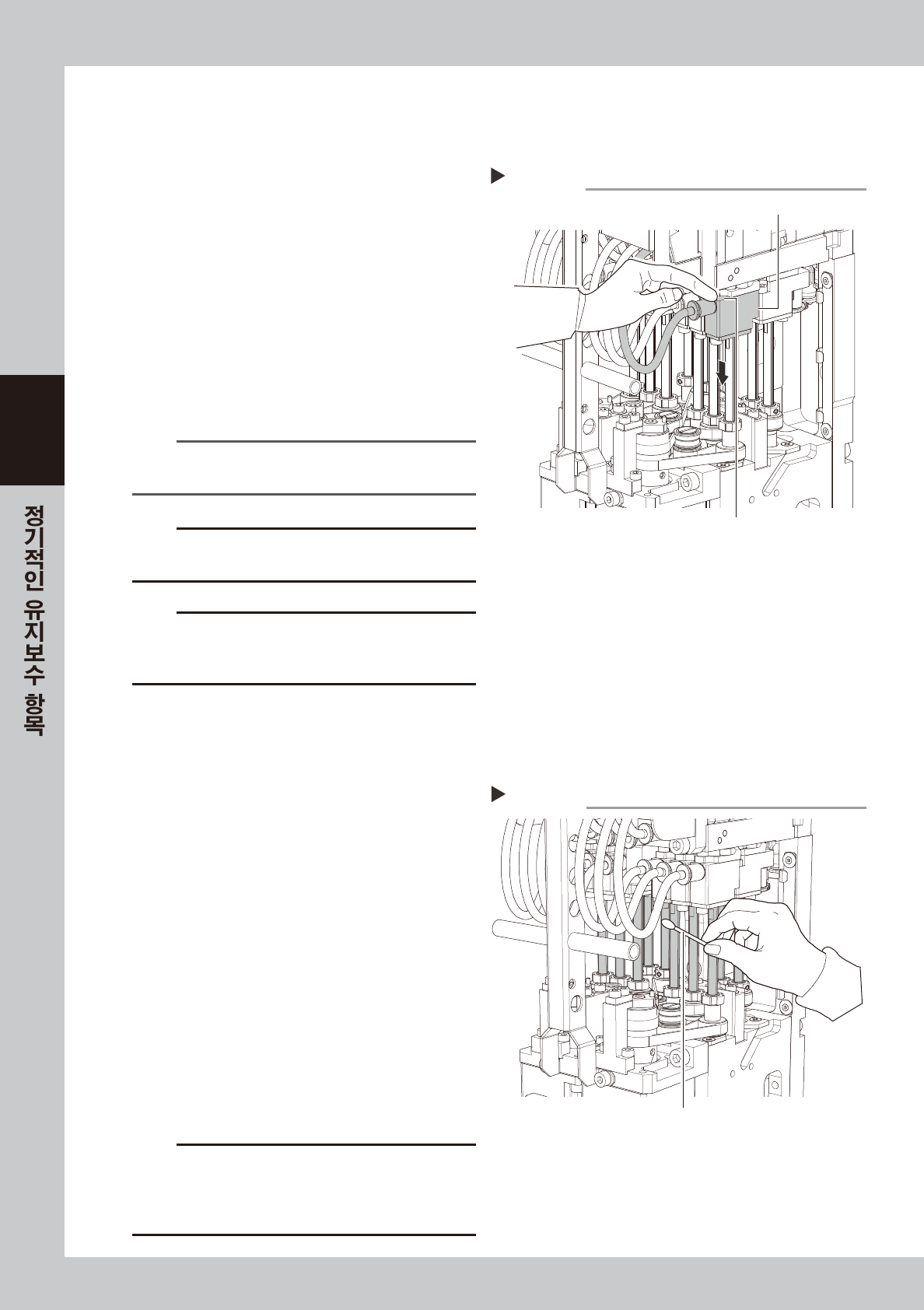 3-33 3 3 . 3 개 월 여 기에 서 는 , 3 개 월을 기준 으로 실시 하 는 유 지 보 수 항목에 대해 서 설명 합니 다 . 3 . 1 MU 헤드 3. 1 . 1 에어 필터 의 청소와 교 환 공 급 에 어 의 상 태 나 가동 시 간에 따 라 다릅 니 다 만 , 일 반 적 으로 3 개 월 간 격 으로 필 터 를 점 검 해 주 십 시 오 . 다 소 의 더 러 움은 에 어 블 로 우 툴 …