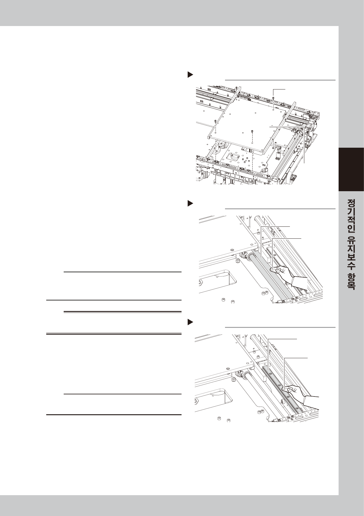 다음과 같이 컨베이어 W 축의 볼스크류 및 가이드의 청소와 급유 방법에 대해서 설명합니다.