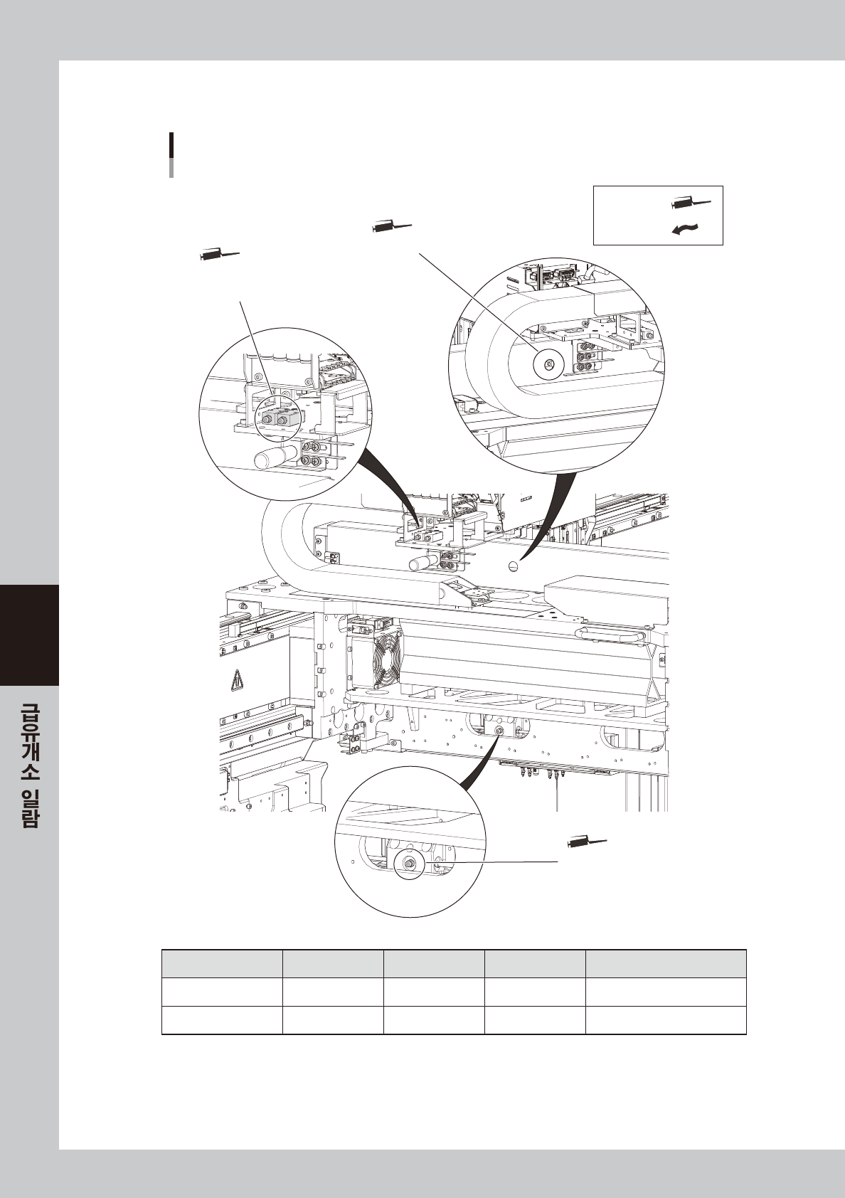5-4 5 2. 1 .2 2 빔 사양 구리스건 : 손으로 도포 : X축의 급유개소 (2빔) 볼스크류, 가이드 X축 볼스크류부 X축 가이드부 하부 구리스 니플 X축 가이드부 상부 구리스 니플 575 0 2- N9 - 0 0 급유부위 구리스종 류 급 유개소 주기 작 업방 법 볼스 크류 NSL 1 ( 각 테이블 ) 1 회 /1 개 월 구리스 건 : 굽은타 입 노즐 가이드 NSL 3 ( 각 테이블…