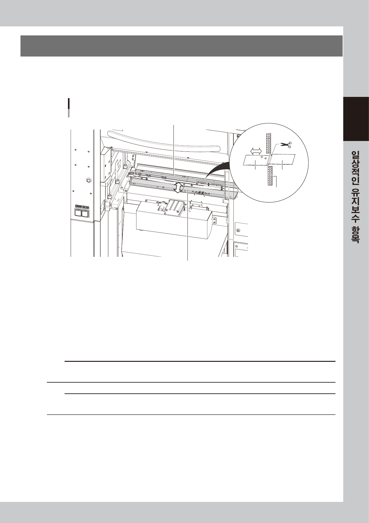 테이프 커터의 점검과 분해, 급유 및 칼날의 교환 작업은 취급상 대단히 위험하므로, 서비스 엔지니어가 대응하도록 되어 있습니다.