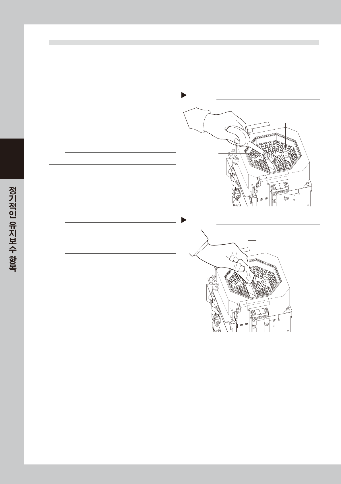 3-15 3 2. 매월 여 기 에서 는 , X 축 Y 축의 볼스크 류와 가이 드 및 리 니 어 스 케 일 의 점검 • 청 소 및 급유를 중 심 으로 설 명합니 다 . 점 검 포 인 트 및 주의 사항은 다음 과 같습니 다 . █ 점검 포인트 1 . 볼스 크류 및 가 이드상에 이물 질의 부착 여부 볼스크 류 및 가 이 드상에 칩 등이 튀 어서 부착되어 있 지 않은 지 확 인 하 여 주십시 오 .…