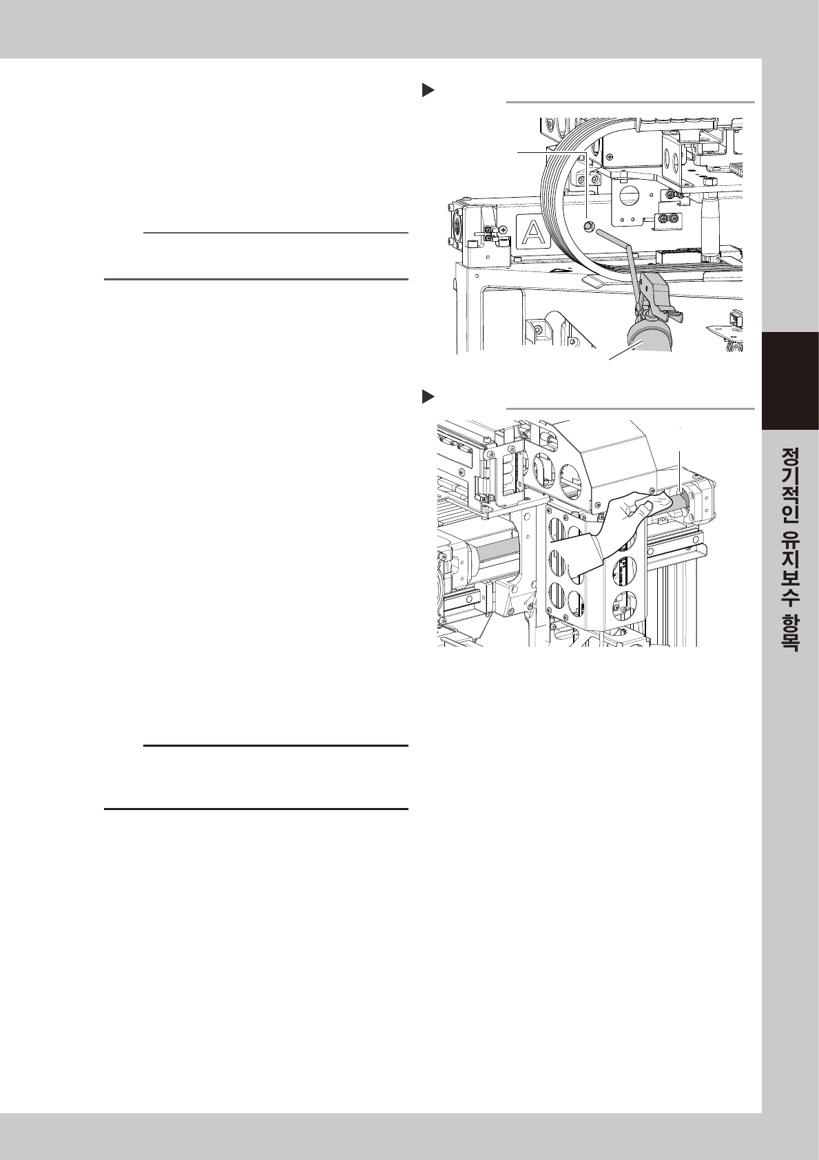 1. 칩 등이 끼이게 되면 볼스크류 및 가이드를 손상시키는 원인이 되므로 , 부착되어 있을 경우는 구리스 채 닦아내거나