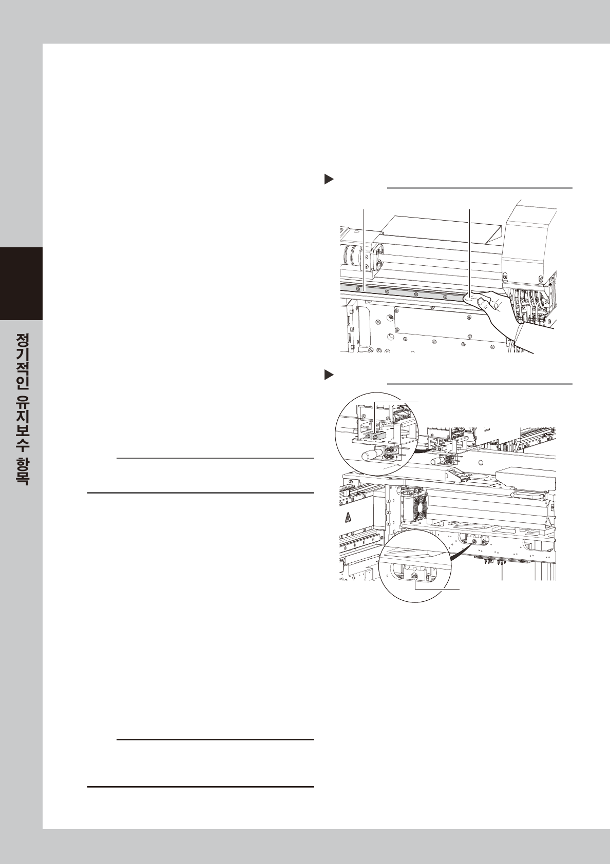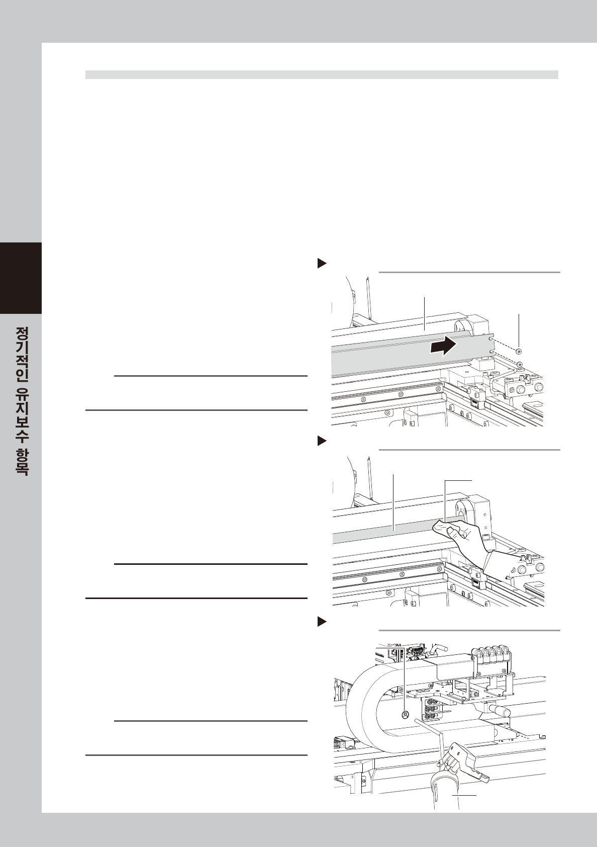 3-23 3 5 여분의 구리 스를 닦 아 냅니다 . 1 . 이동 핸 들을 잡고 헤 드 유닛 을 한쪽으로 이 동 시킵니다 . 2. 볼스크 류 및 볼스크 류 단면 에 고 인 여분 의 구 리스 를 닦 아 냅니다 . 3. 헤드 유닛 을 반대 쪽 으로 이 동시 켜서 , 반 대 쪽 의 볼스크 류 및 볼 스크 류 단 면 에 고 인 여 분 의 구 리스 도 닦 아 냅니다 . 57 32 5-N9-00 6 워밍…