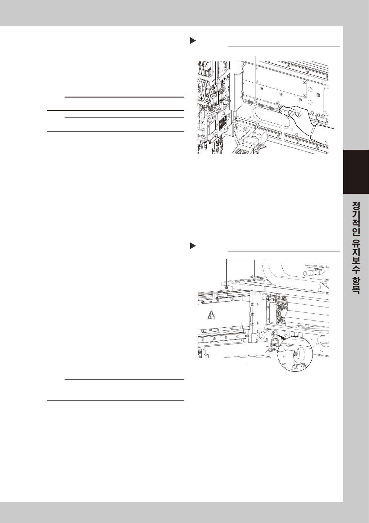 3-26 3 7 워밍 업 운 전을 합니다 . 1 . 깔 아둔 사 각건 을 제거 합니다 . 2. 장비의 커 버를 닫 고 , 대차를 사용하 고 있 을 경 우 세 팅 한 후 , 비상정 지를 해 제 합니다 . e 3. 워 밍업 화 면 을 표시 해서 8 분 정 도 워 밍업 합 니 다 . 정지 후 , 비 상정지 버튼을 누르고 가 이 드 및 가이드 단면에 고 인 구리 스를 닦습니 다 . c 주의 구리스 …