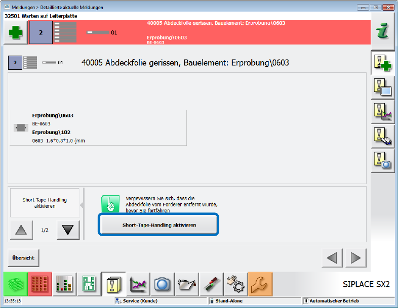 In der Fehlermeldung Abdeckfolie gerissen … wird dann die Option Short-Tape-Handling