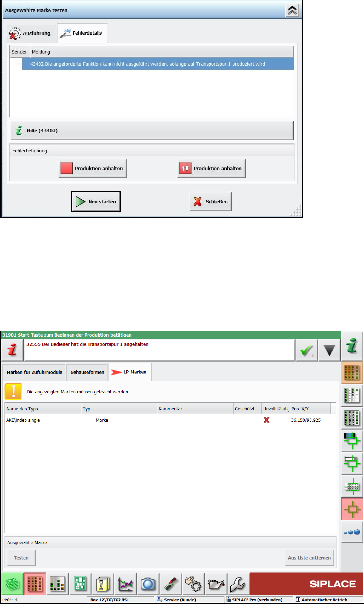 Detaillierte Fehler führen nur zum Anhalten der betroffenen Transportspur. Die Transportspur wird