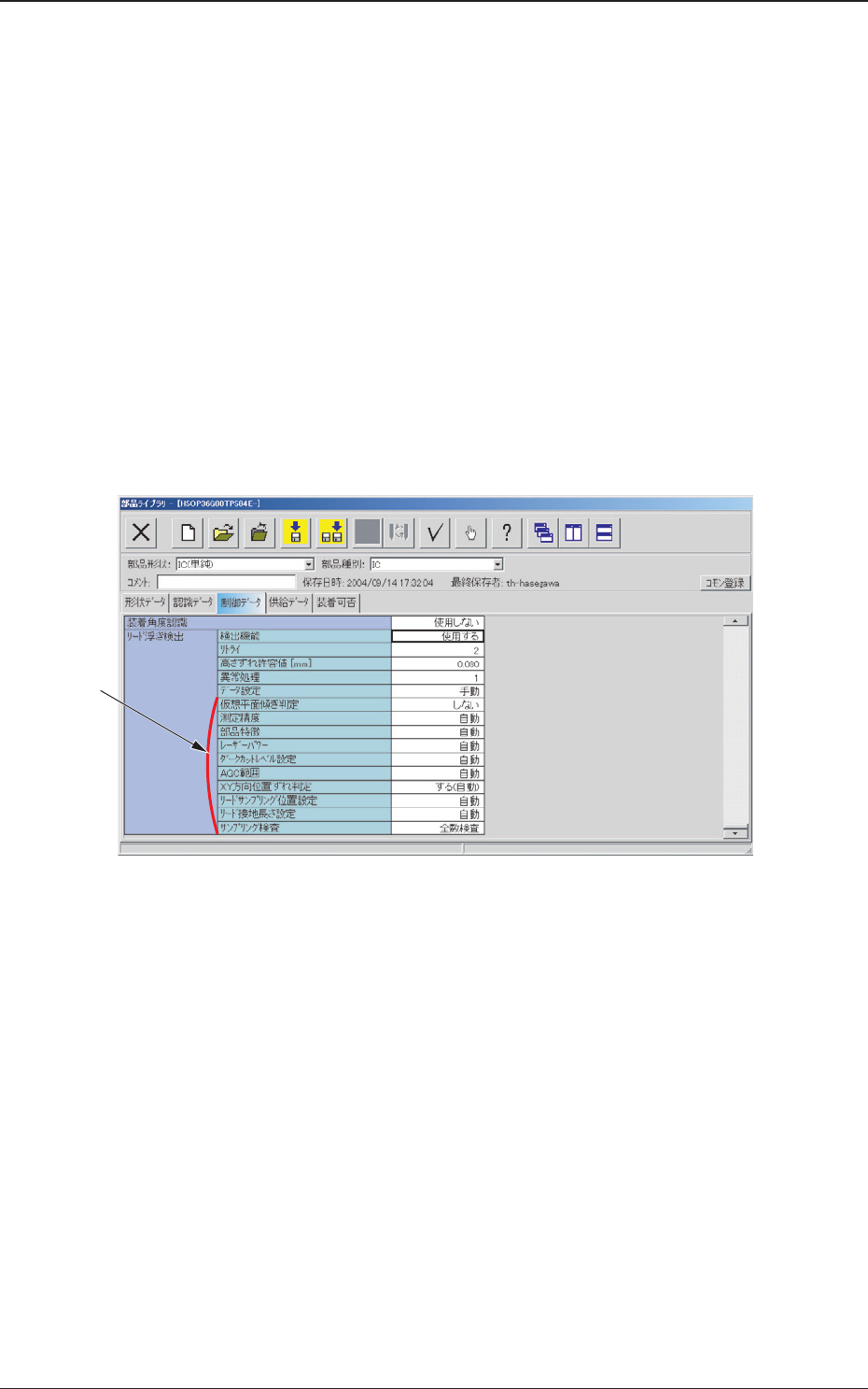37 7. 部品ライブラリ 仮想平面傾き許容値 仮想平面傾き判定が “ する ( 手動 )” のときに表示されます。 仮想平面の傾きの許容値を入力します。 ノート 0 を設定すると仮想平面傾き判定を行いません。 測定精度 自動(デフォルト) 測定精度 ( 標準 / 高精細 ) の設定を、部品情報から自動で設 定します。 標準 標準像度で検査を行います。 SOP、QFP、コネクタ リードピッチ 0.4 mm 以上の場合に設定します。 BG…