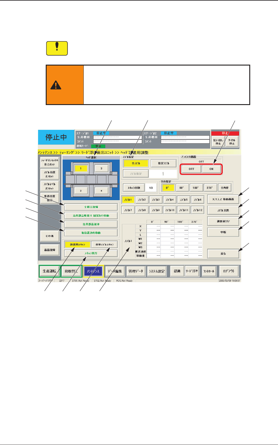 50 9.1 センサヘッド設置用調整 [3] リード浮きユニット測定値表示 [ ノズル 1] ~ [ ノズル 12] ボタンを選択すると、ノズルごと の設定値が表示されます。 ノート 操作画面は、高速ヘッド ( 標準仕様 ) の場合を示します。 多機能ヘッド ( 多機能ヘッド仕様:HM-G100) の場合は、 [ ノズル 1] ~ [ ノズル 3] と表示されます。 ノズルごとにリード浮き検出ユニットにて 0 ° 、 90 ° 、180…