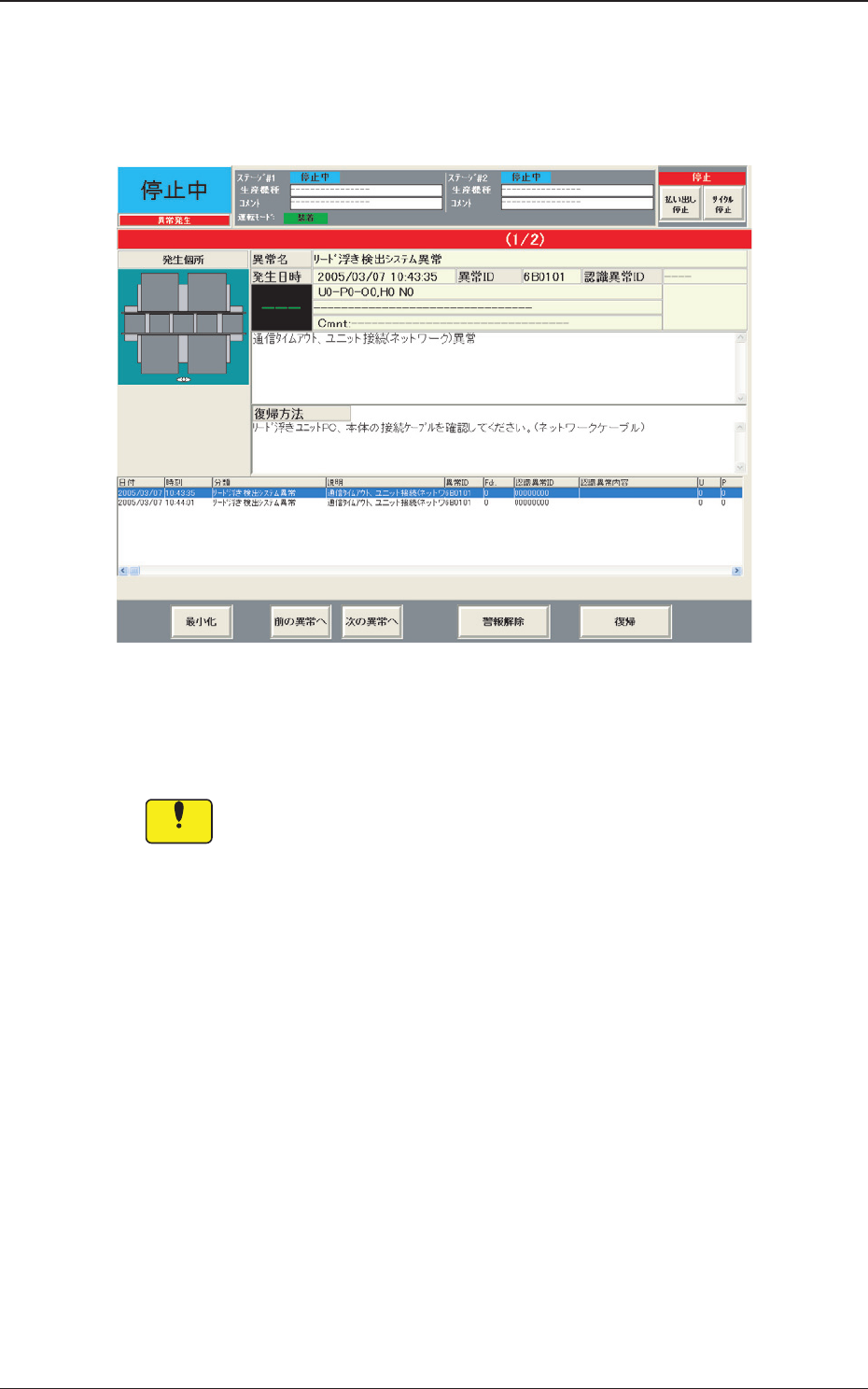 装置が異常を検知した場合、以下のような異常表示画面が表示され