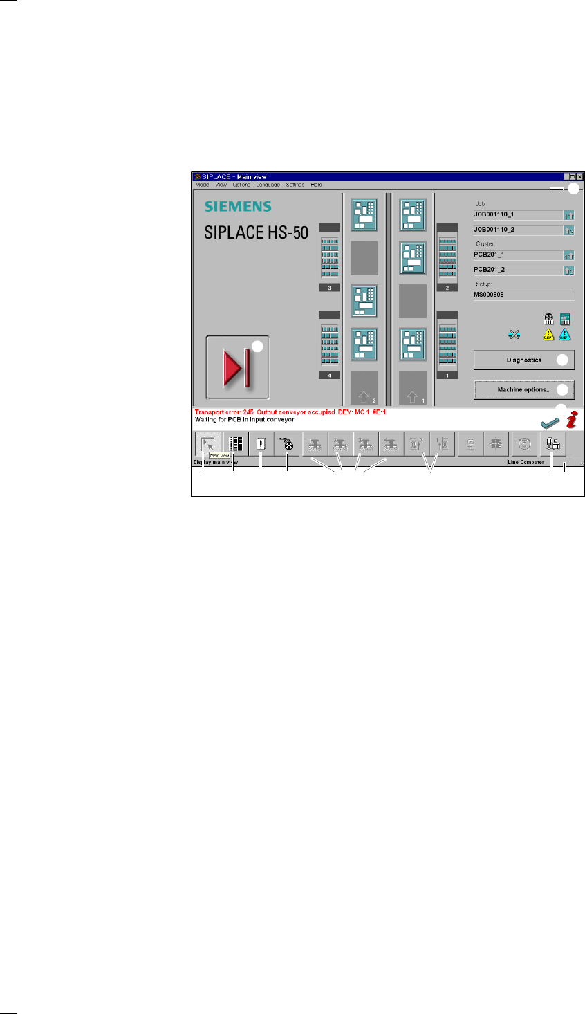 24 Operat or Guidance ’ Main view ’ menu (user level: ’ operator ’ ) Y ou can contr ol the operation o f the machine fro m the ma in view. All of the menus and options accessible to the opera tor can be ac cessed f rom t…