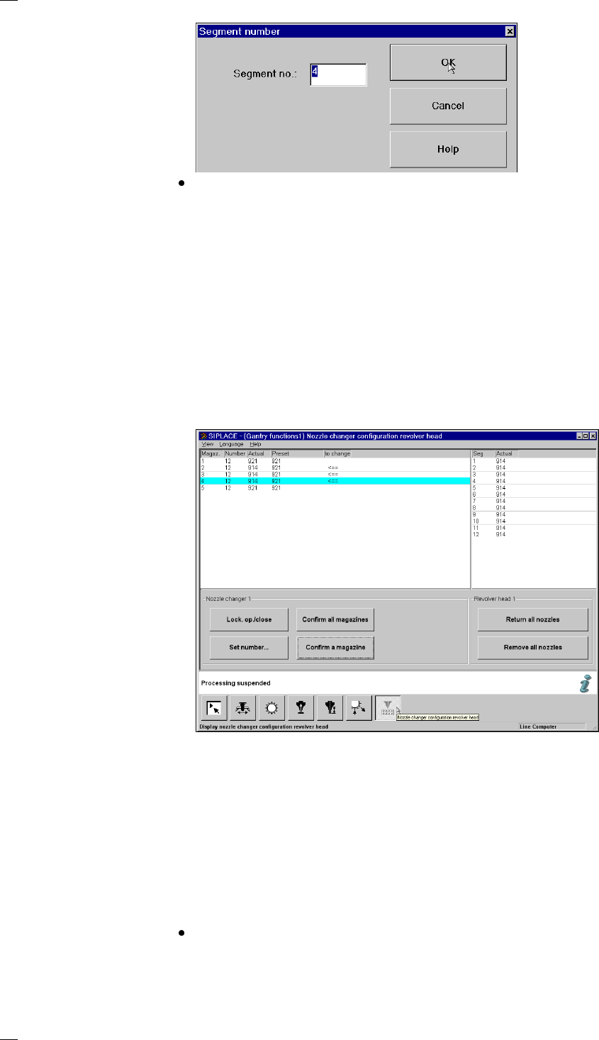 37 ’ Nozzle configura tion revolver hea d ’ menu Within the Nozzl e configurat ion revolver head me nu you can view the noz- zle configur ation and check nozzle s. If a no zzle changer has been installed you can change t…