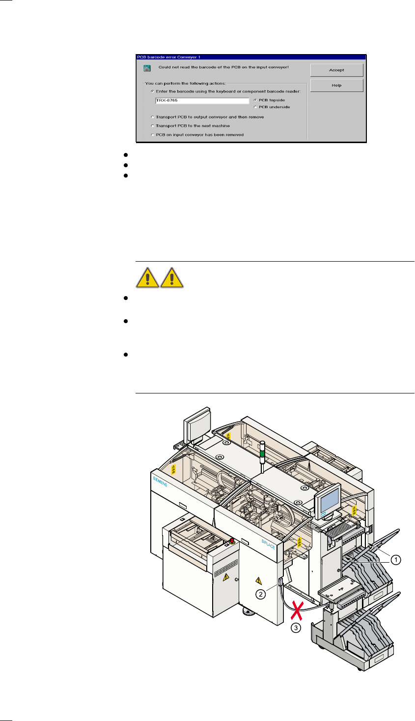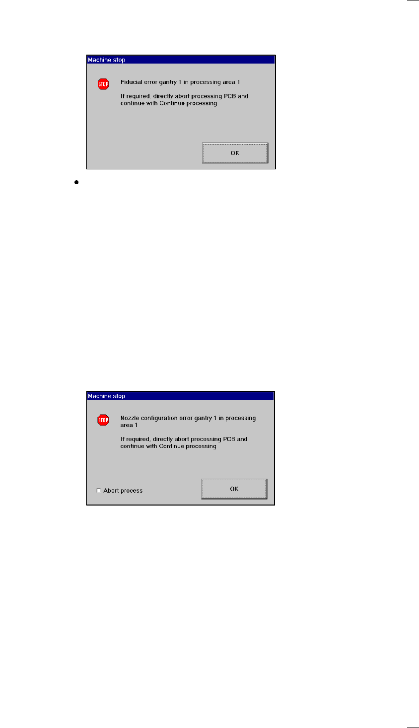 45 Fiducial errors This error me ssage wil l be displayed if it was not possible to find or detect a fiducial. Click on OK to ackno wledge and t hen selec t from the fun ctions display ed: Abort proces s. PC B Wi th this…