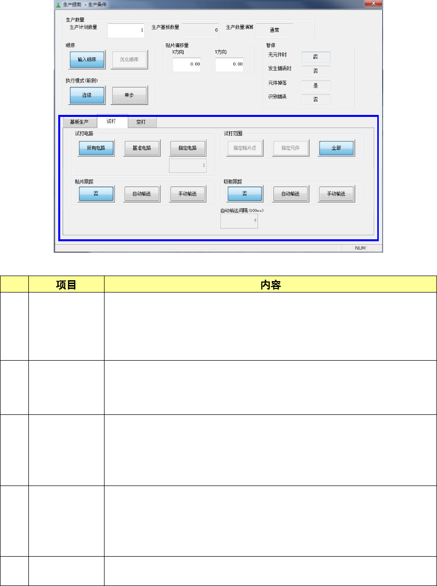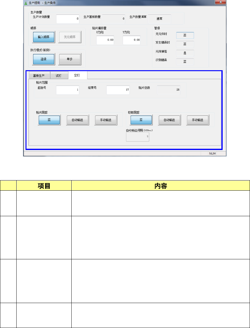 第 1 部 基本篇 第 2 章 生产 2-39 (3) 空打 No. 1 贴片范围 需限定贴片 范围时, 请输入开始步骤号和 结束步骤 号。 在总贴片点 数项中显 示每 1 个 电路中的总 贴片步骤号。 仅在设定为 输入顺序 时才能指定此项。 2 贴片跟踪 设置在空打 基板后, 是否用摄像机进行贴 片点跟踪 , 以及跟踪时 是自动输 送还是手动输送。 · 否 :不跟踪。 · 自动输送: 自动跟踪 贴片点。 · 手 动输 送 : 在贴 片…