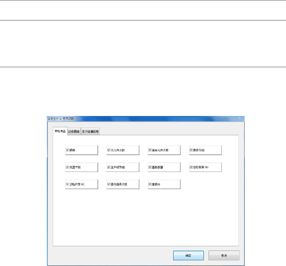 第 1 部 基本篇 第 2 章 生产 2-135 2-13 工具 2-13-1 操作选项 从生产菜单 选择 [ 工具 ] → [ 操作选项 ] 后, 仅显示操作 选项画面。 详见「第 7 章 操作选项」 。 2-13-2 显示项目设置 从生产菜单中 选择「工具 」→「显示错误 日志」后,即显 示错误日志画 面。 对生产中显示 项目的 显示 / 隐藏进行设置 。 单通道生产与 双通道 生产的生产状态画面 的显示项目 不同。 可在「单轨传 …