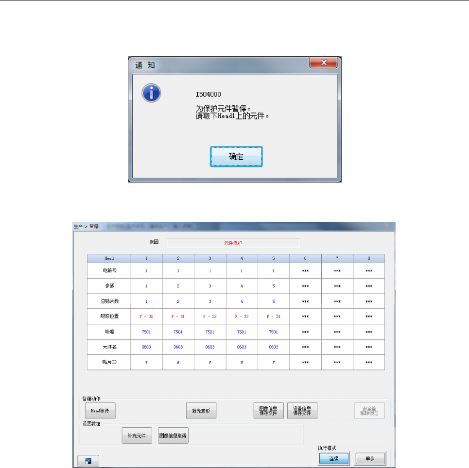 到元件保护位置后,显示通知画面,暂停生产。