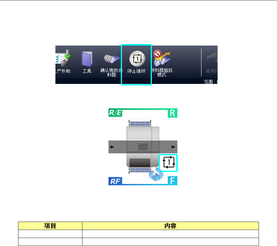 第 1 部 基本篇 第 2 章 生产 2-172 2-15-11 循环停止 按下主菜单 的循环停 止开始按钮 ,在简 易显示阅览器中 显示 循环停止图标时, 即进入 循环停止模式 。 循环停止模 式是指, 生产中在基板贴片结束时 ,搬 出基板,结束生 产。此种方式, 视为正常的结束 生 产。 在循环停止 模式中, 再次按停止循环 按钮时,循环停 止模式即被 解除。 在循环停止 模式中结 束生产的时间点 , 可在操作选项的 「生产/动作」…
