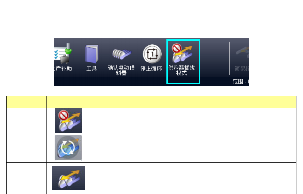 在生产过程中,如果按下主菜单的供料器插拔模式按钮,则可以在通常模式和插拔模式间相互切换。