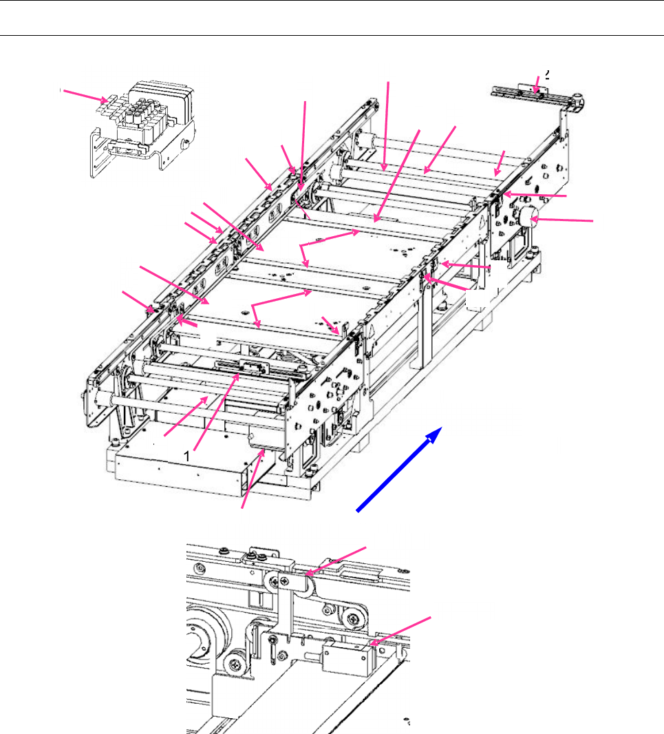 第 1 部 基本篇 第 1 章 装置概要 1-10 1-2 本装置的 构造 1-2-1 基板传送部分的构造 ・ 基板传送部的构 成 ( 单通道 ) 2 1 15 11 3 4 8 10 11 12 10 13 14 17 16 18 11 7 5 9 12 6 21 20 22 23 基板传送方向 1 IN 传感器 9 传送电磁阀 17 支撑销检出 传感器受光 2 OUT 传感器 10 传送马达 18 挡块传感器 3 WAIT 传感器光…