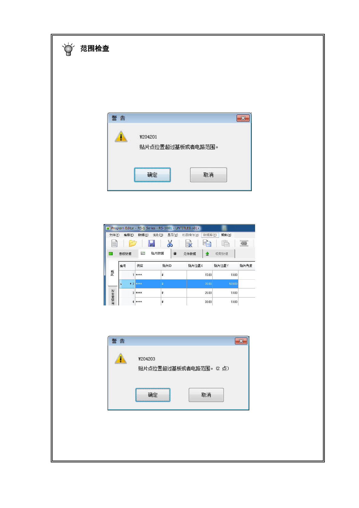 在输入贴片位置 X 或 Y 时,或分别进行了改变时,将进行范围检查。